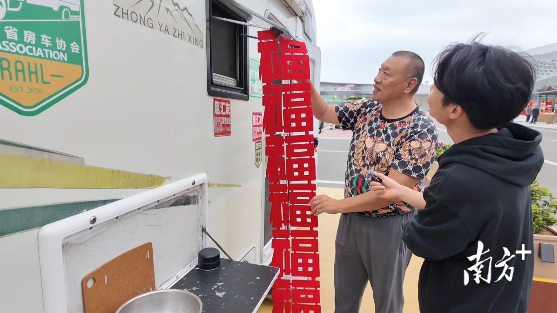 温大哥给房车挂上新春的装饰。
