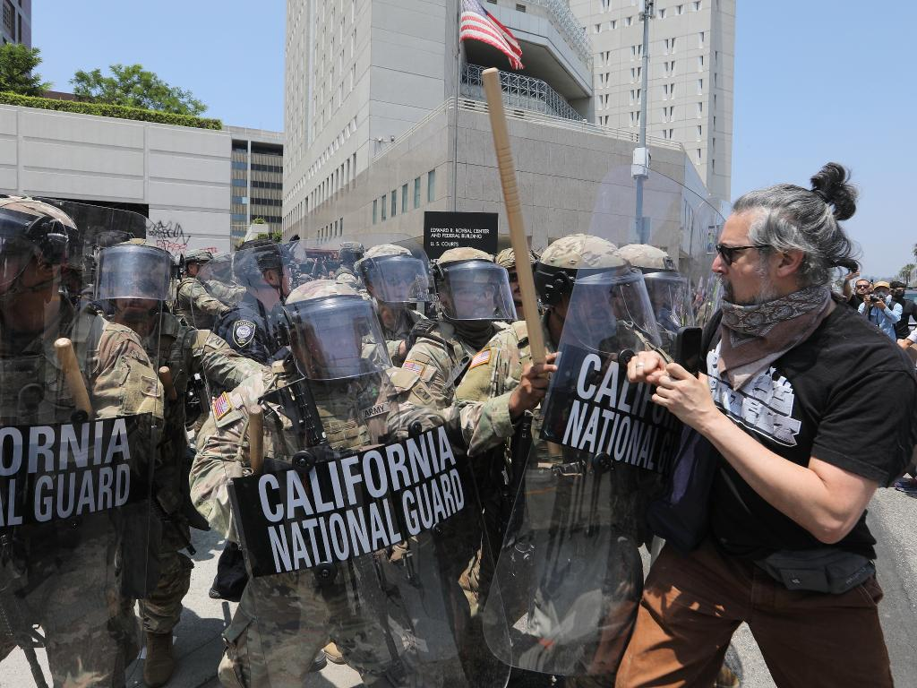 6月8日,在美国加利福尼亚州洛杉矶市中心的联邦执法机构门前,抗议者与国民警卫队人员发生冲突。新华社发