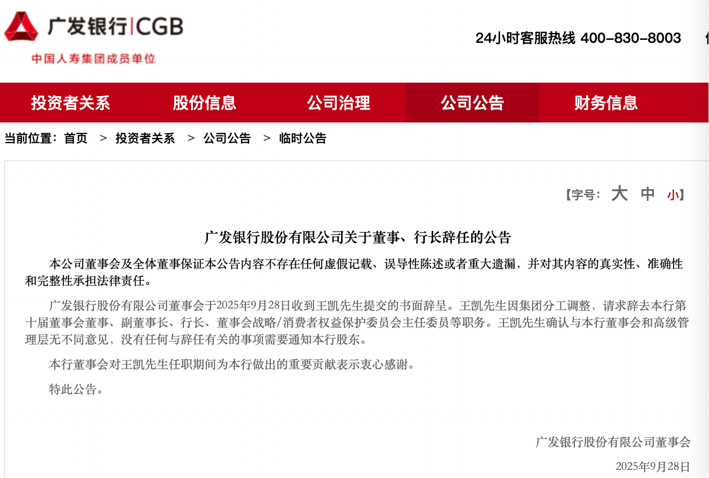 广发银行官网9月28日发布的公告显示,公司董事会于2025年9月28日收到王凯提交的书面辞呈。王凯因集团分工调整,请求辞去该行第十届董事会董事、副董事长、行长、董事会战略/消费者权益保护委员会主任委员等职务。王凯确认与本行董事会和高级管理层无不同意见,没有任何与辞任有关的事项需要通知本行股东。