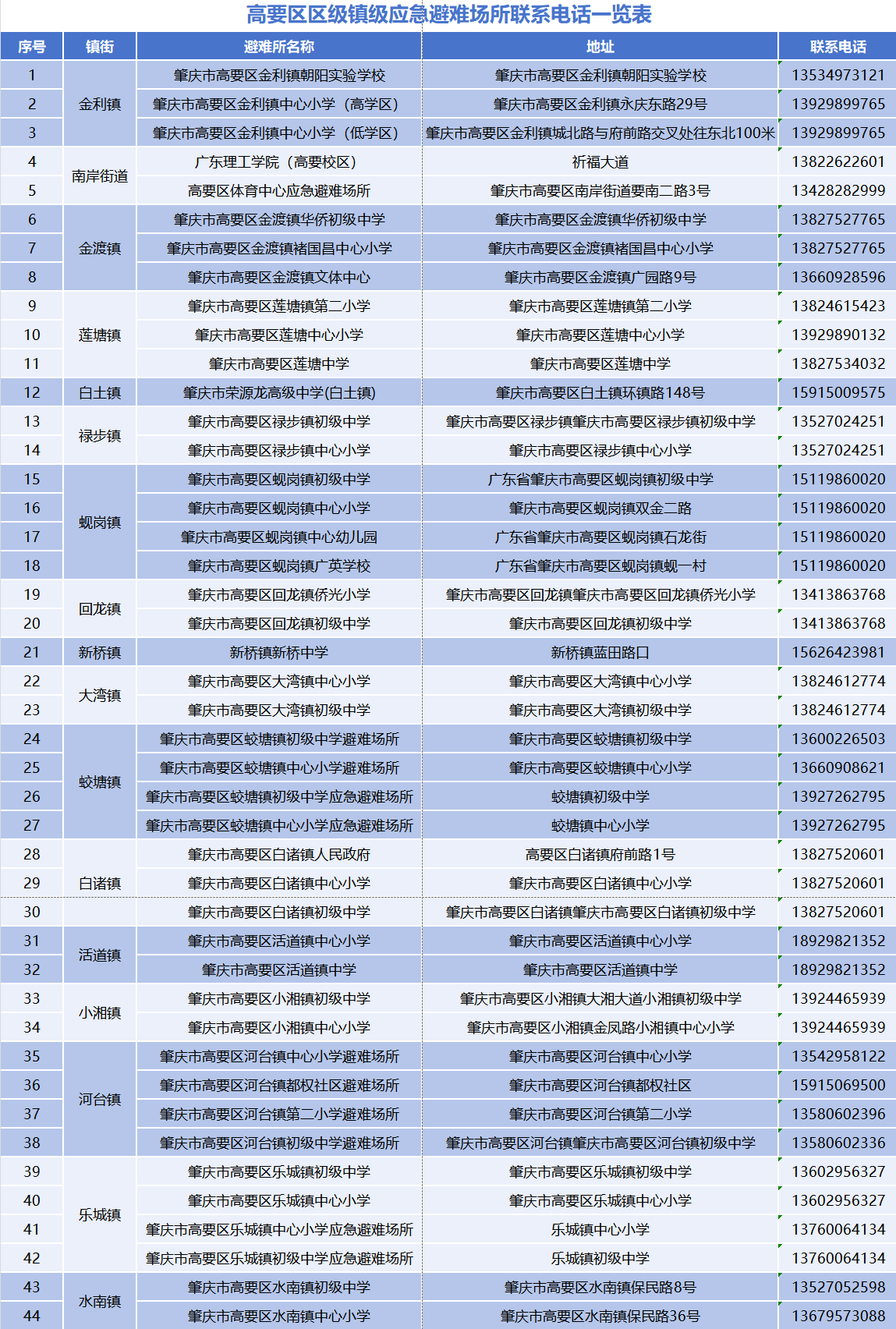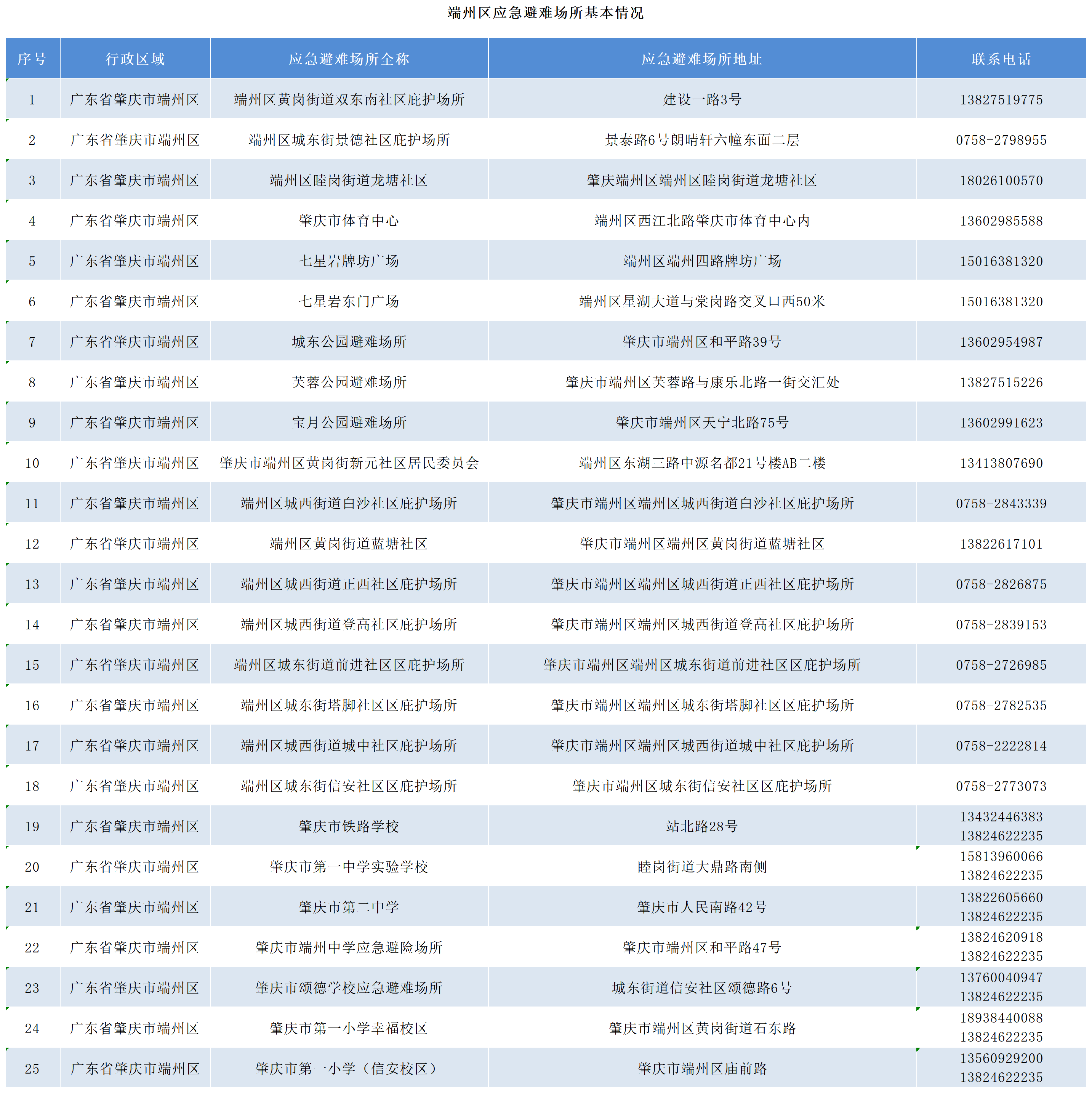 目前,肇庆市端州区25个应急避难场所、高要区44个应急避难场所对外开放,为周边有需要的居民提供临时避险空间,切实保障人民群众生命财产安全,市民有需要可自行前往。