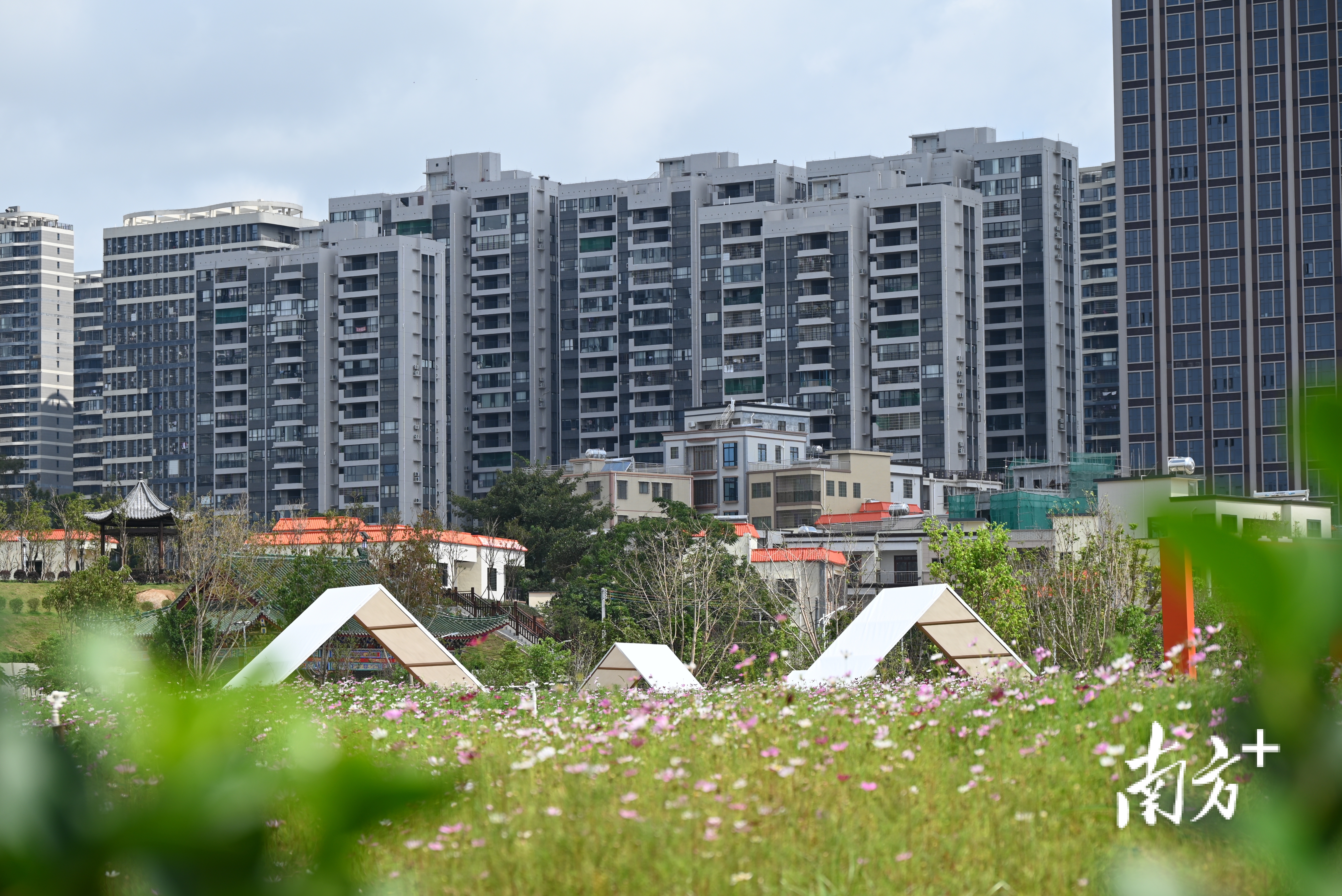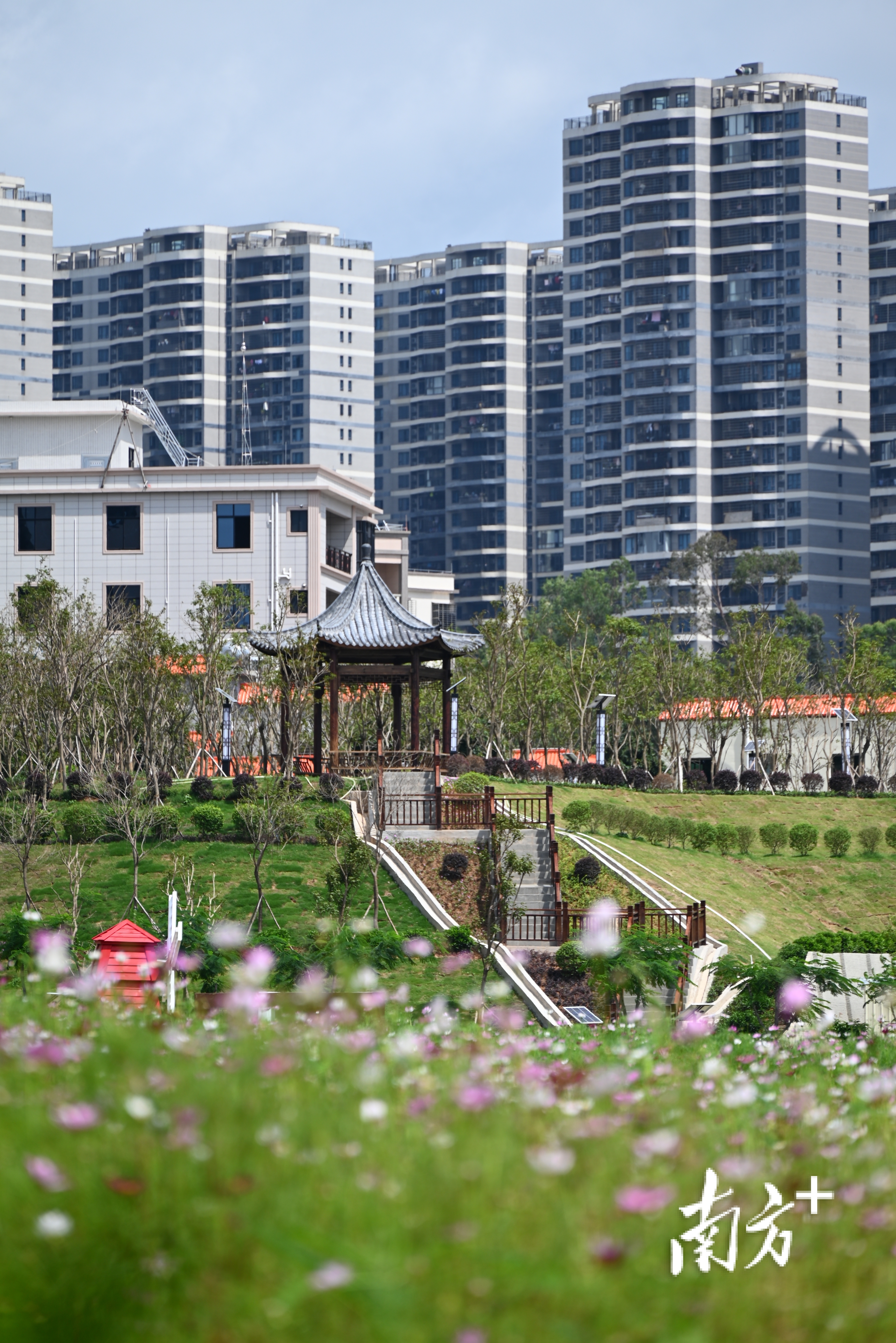 拾级登临,既能将百亩花海、体育公园尽收眼底,也能俯瞰周边村居的红瓦白墙点缀在花海之间,看见城市高楼的玻璃幕墙在远处闪烁,一幅城乡共生的画卷就此铺展。