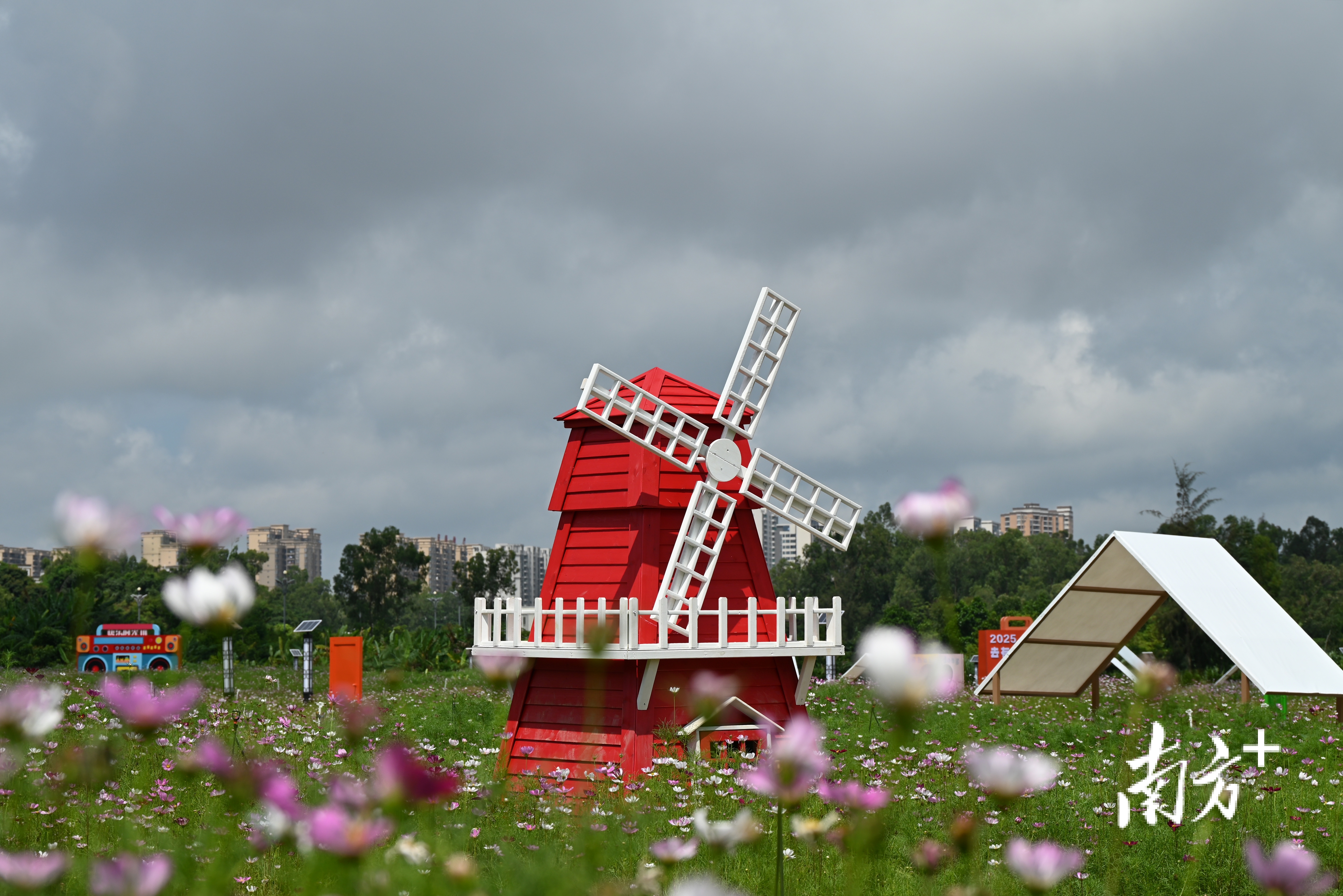 花海之中还建起了风车小屋、热气球、录音机、悬浮阶梯等许多个小景,引得游人频频驻足留影,甚至连蜜蜂、蜻蜓、鸟儿都沉醉其间,在花丛中画出一道道弧线。