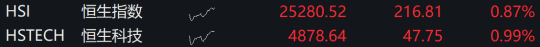 恒生指数高开0.87%,恒生科技指数涨0.99%。洛阳钼业涨近7%,农夫山泉涨逾6%,老铺黄金涨逾5%,紫金矿业、商汤涨逾3%。