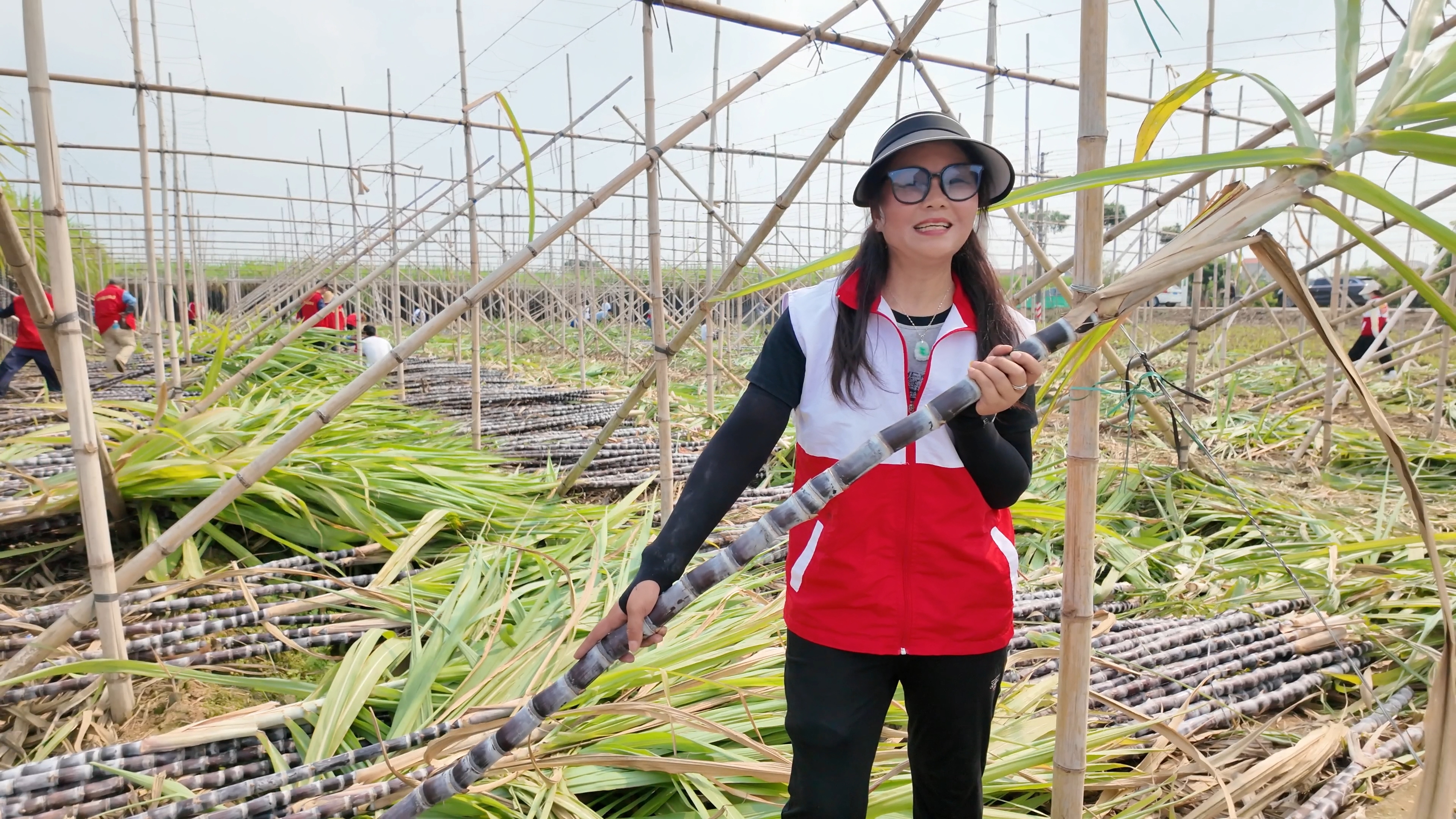 3月23日一大早,蔗田晨雾未散,已是一派热火朝天的劳作景象。200 多人分成四支队伍,分散在不同蔗田,弯腰、砍蔗、削叶、捆扎、搬运,动作娴熟又卖力。不少年轻员工是第一次砍甘蔗,经过简短培训便迅速上岗,汗水浸湿衣衫,手上磨出薄茧,却依旧笑容满面。“看着蔗农焦急的眼神,再累也值得,能帮他们多砍一根是一根。”一名物业员工笑着说。