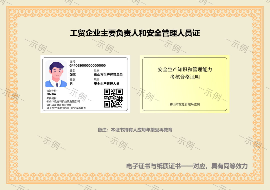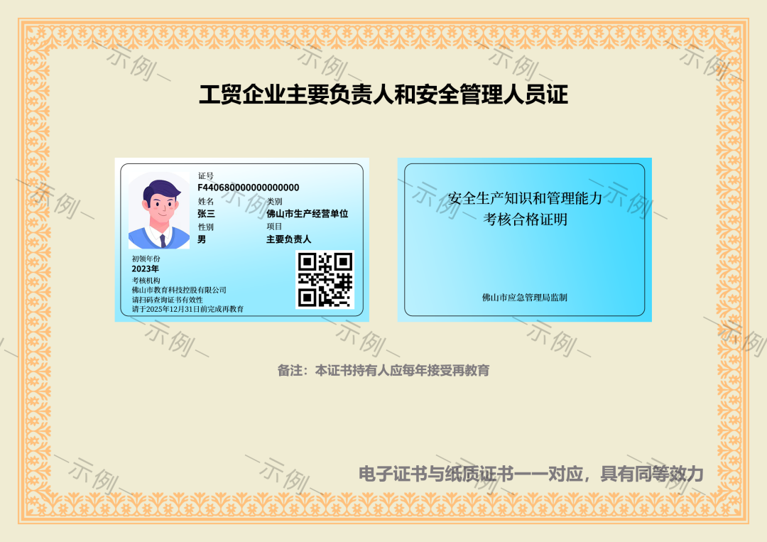 学员联系培训机构参加线下培训、报考。考试及格后获得佛山“两类人员”《安全生产知识和管理能力考核合格证明》,电子版证书可通过佛才通微信小程序查询下载。