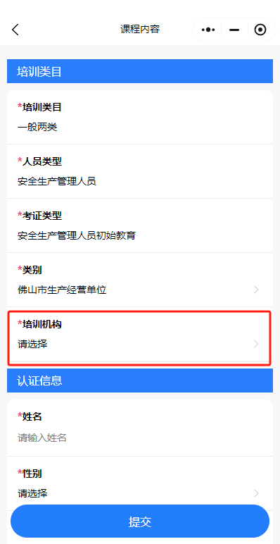进入报名页面后,选择培训机构、填写基本信息,提交至机构审核。