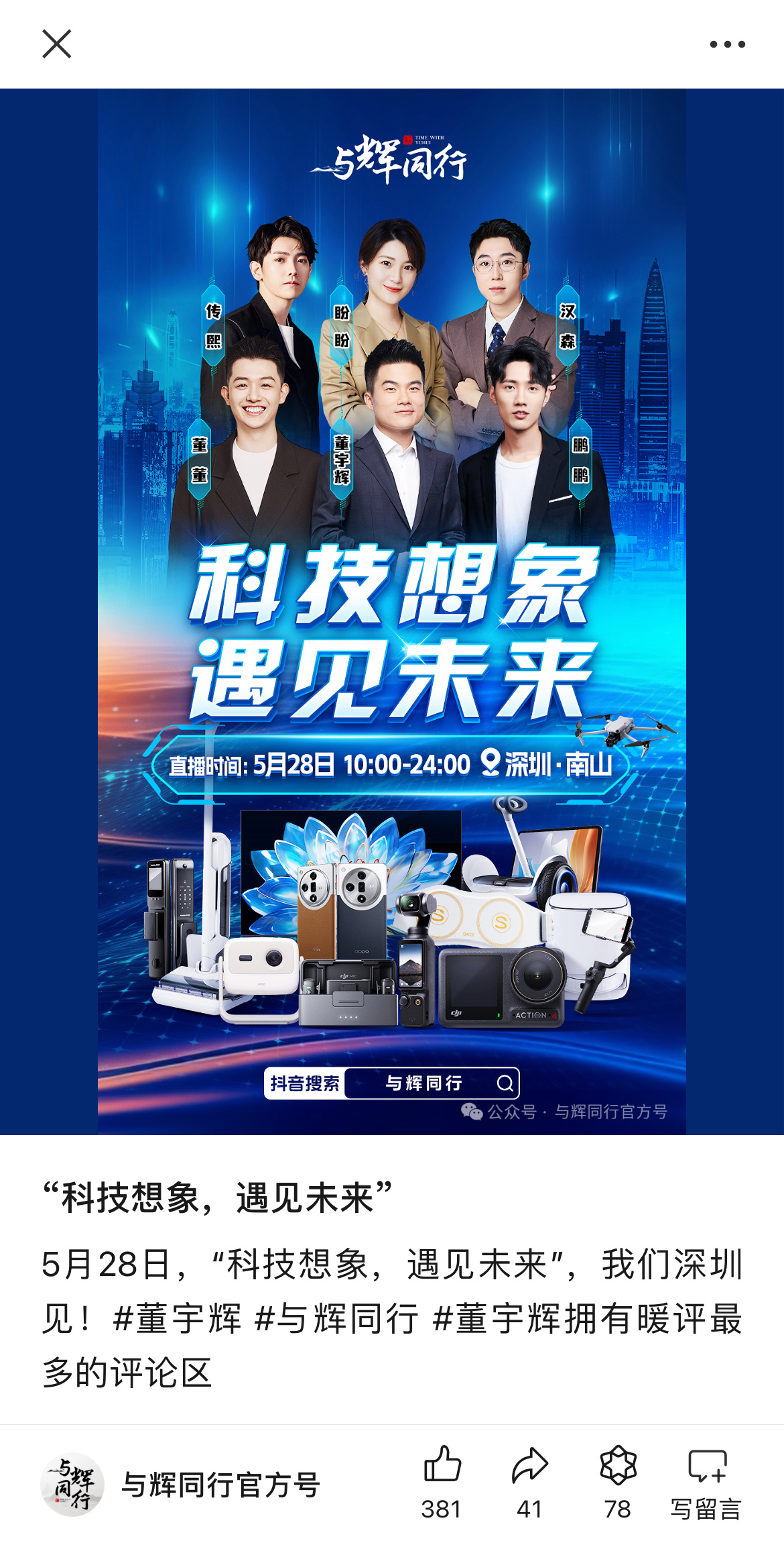 董宇辉要来深圳啦!与辉同行官方号微信公众号官宣,5月28日,董宇辉将带领“与辉同行”团队来一场“深圳南山行”,开启一场别开生面的科技产品推广之旅。