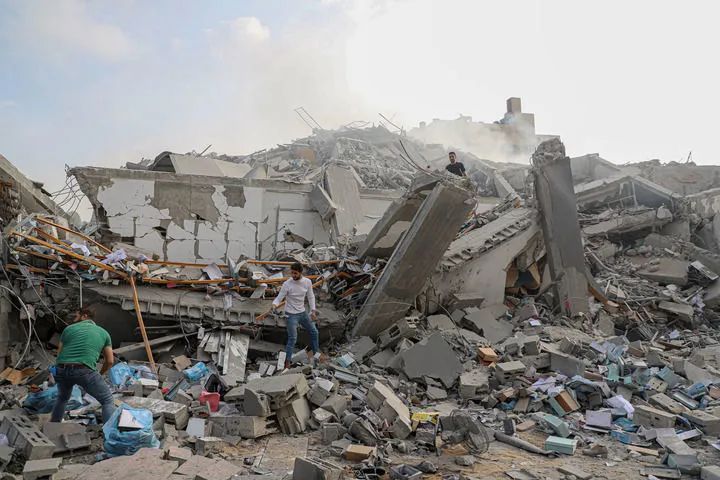 10月8日,在加沙城,巴勒斯坦人查看以色列空袭后的建筑废墟。新华社发(里泽克·阿卜杜勒贾瓦德摄)