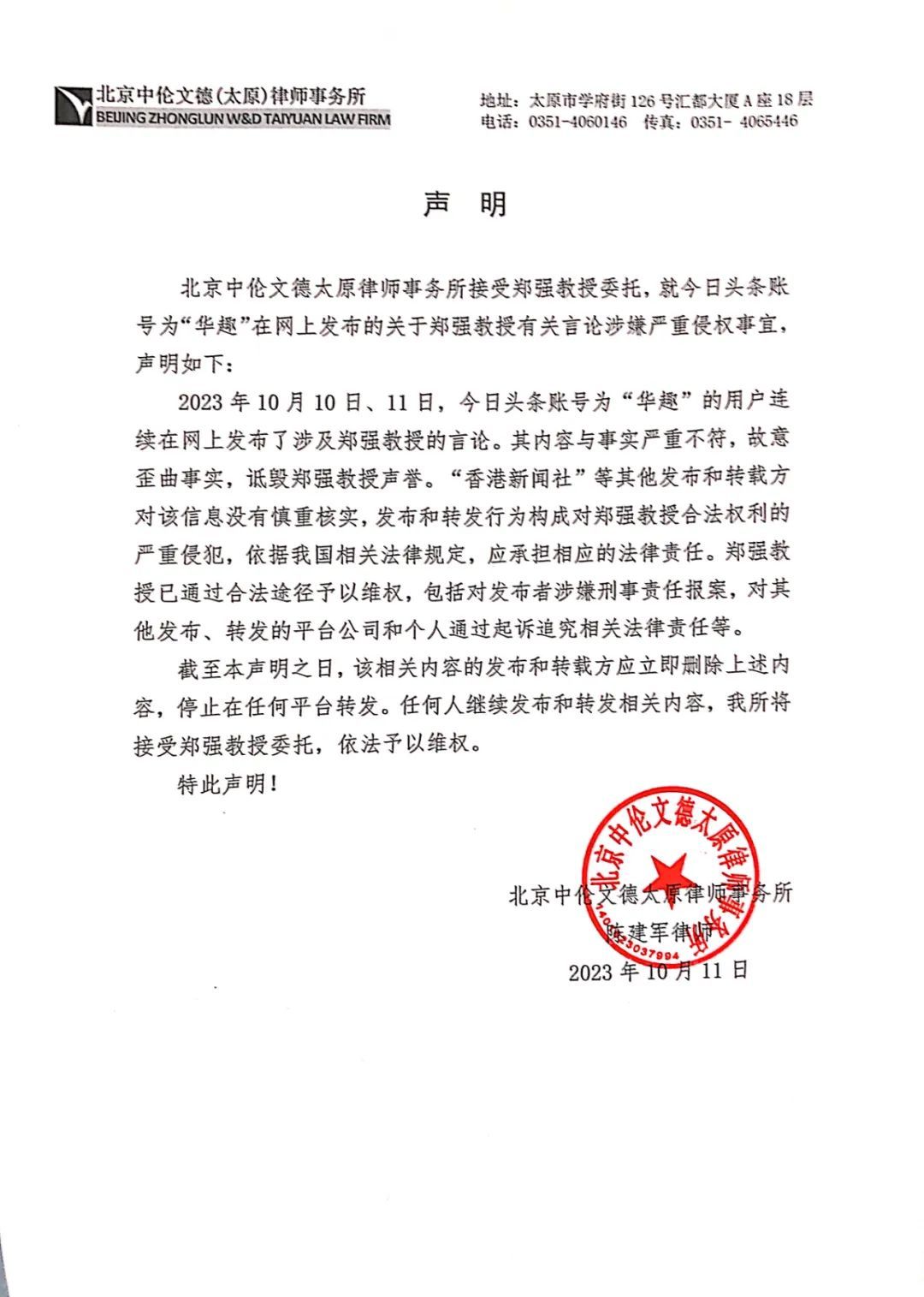 此外,北京中伦文德太原律师事务所接受郑强教授委托发表声明。声明称,郑强教授已通过合法途径予以维权,包括对发布者涉嫌刑事责任报案,对其他发布、转发的平台公司和个人通过起诉追究相关法律责任等。