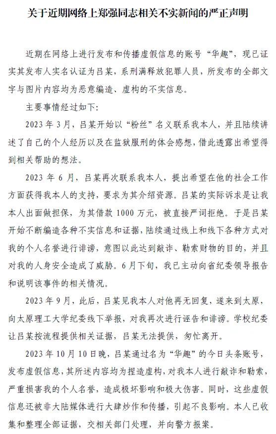 10月12日中午,郑强教授通过微信公号发布《关于近期网络上郑强同志相关不实新闻的严正声明》,称“近期在网络上进行发布和传播虚假信息的账号‘华趣’,现已证实其发布人实名认证为吕某,系刑满释放犯罪人员,所发布的全部文字与图片内容均为恶意编造、虚构的不实信息”。