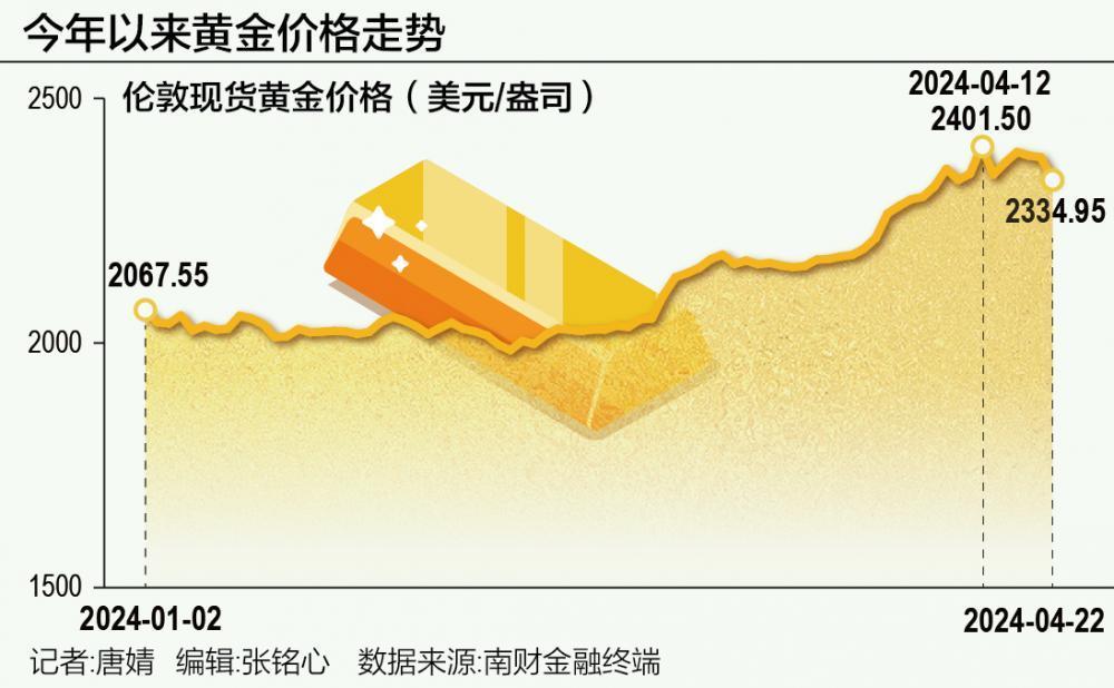 4月22日,国际金价重挫近3%,失守2350美元关口,创下去年2月以来最大单日跌幅。4月23日,现货黄金延续跌势,截至发稿已经跌破2300美元/盎司整数关口,两个交易日跌去超3.3%,引发市场对黄金涨势是否熄火、更大的回调是否在路上的热烈讨论。