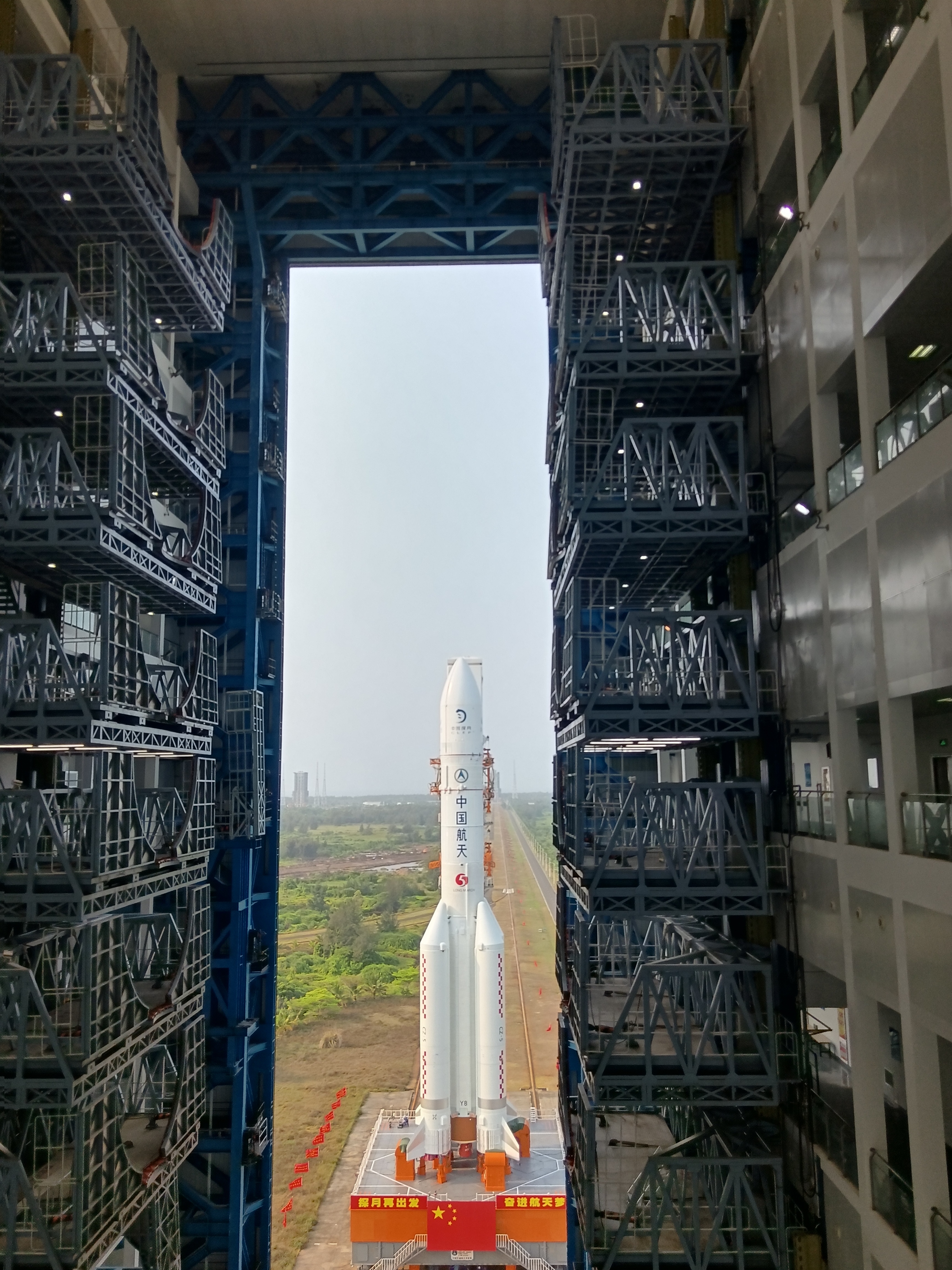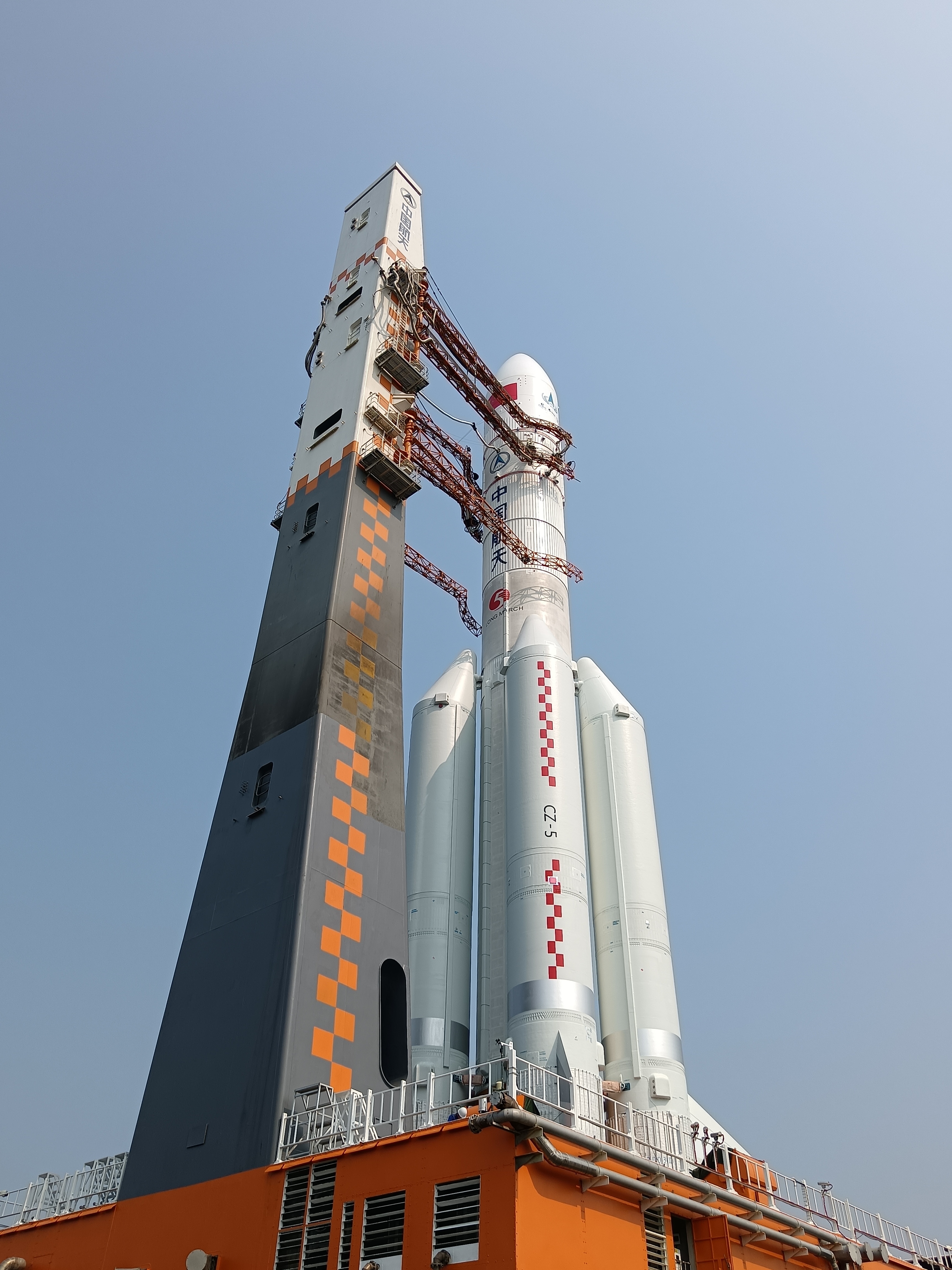 4月27日,承载着长征五号遥八运载火箭的活动发射平台,缓缓将器箭组合体从垂直测试厂房安全转运至发射区。后续将按计划开展各项功能检查、联合测试、推进剂加注等工作。