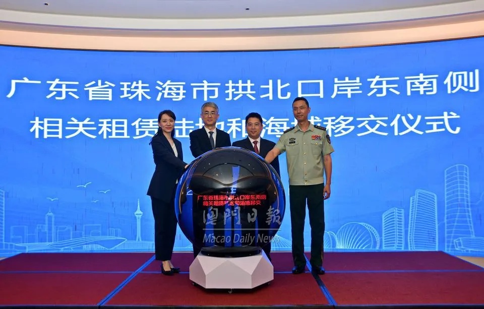 澳门特区政府行政法务司司长张永春,珠海市委副书记、市长黄志豪,澳门中联办经济部副部长杨皓,武警广东总队珠海支队支队长朱晖共同启动装置,标志着上述陆地和海域正式由珠海移交本澳管辖。