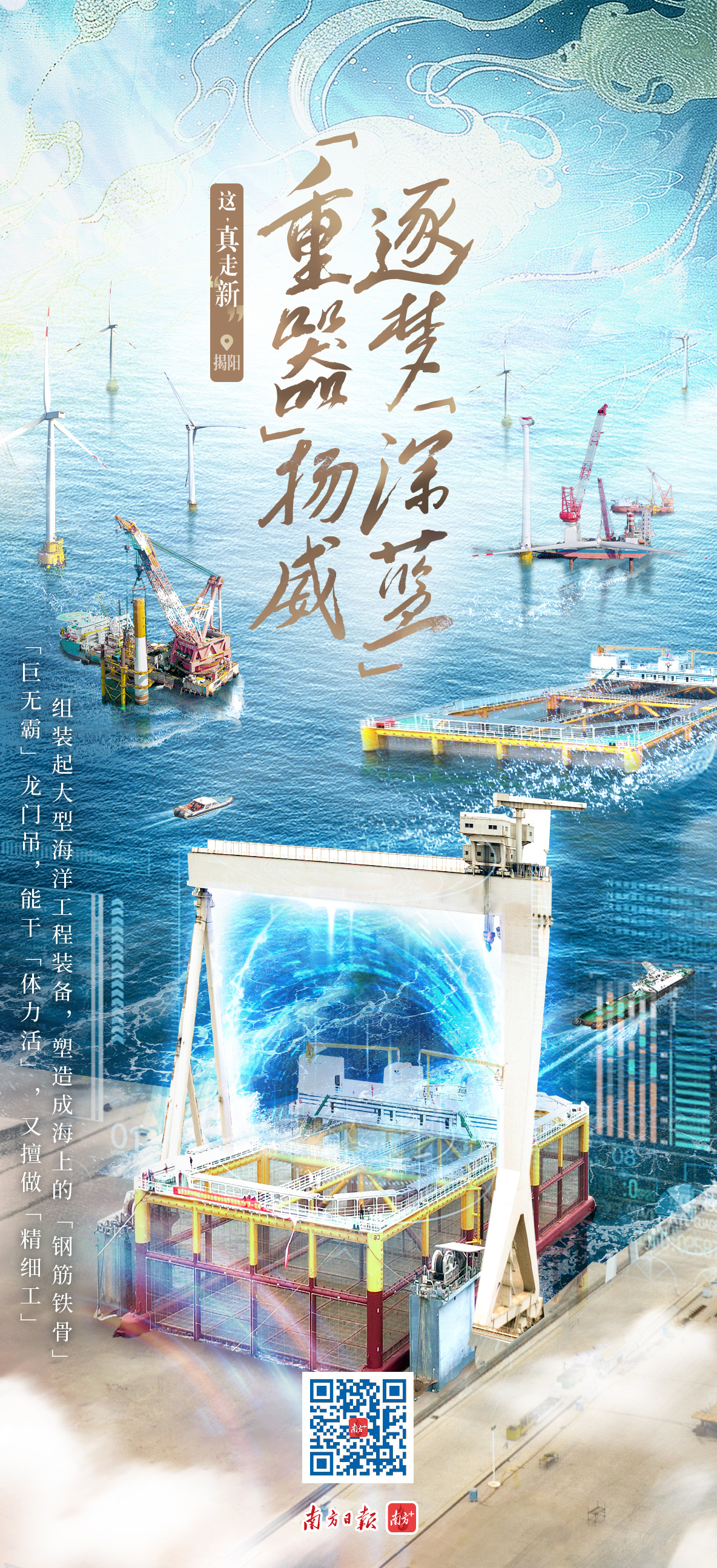 今年7月,天顺风能造出第一批揭阳自主生产的导管架,靠的就是这个“巨无霸”。导管架高约80米、重约2000吨,扛得了台风吹击,耐得住海水侵蚀,是大型海上风机在深海站稳的坚实底座。这些导管架如今已在海上“上班”了。