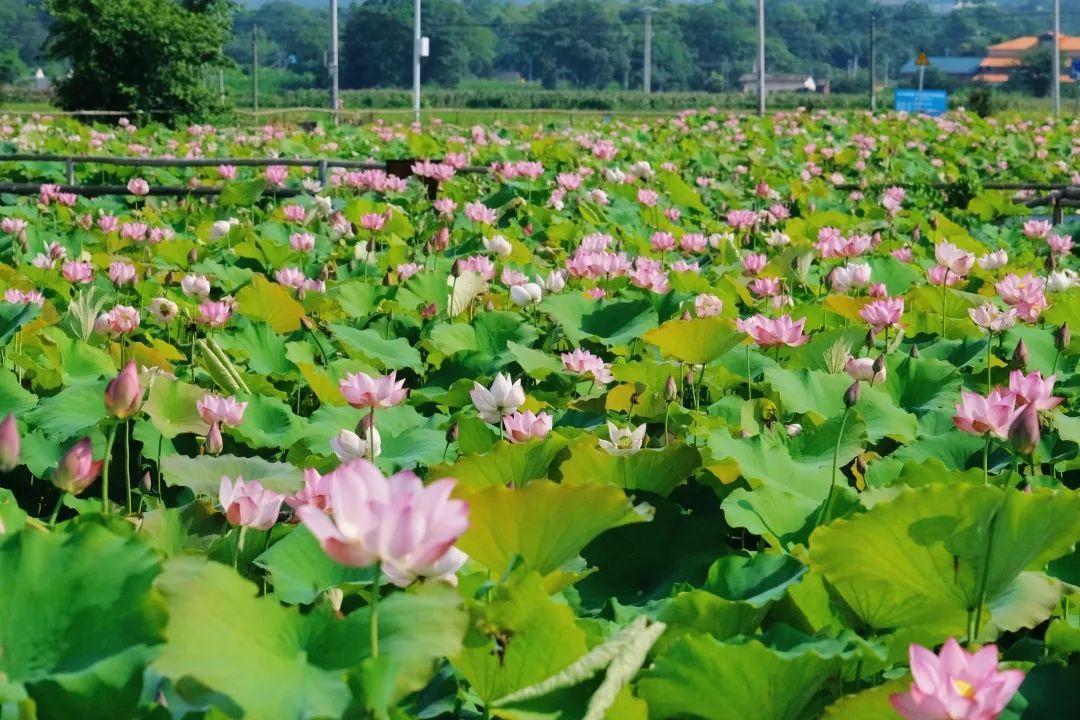 荷叶、村庄、绿叶和花海