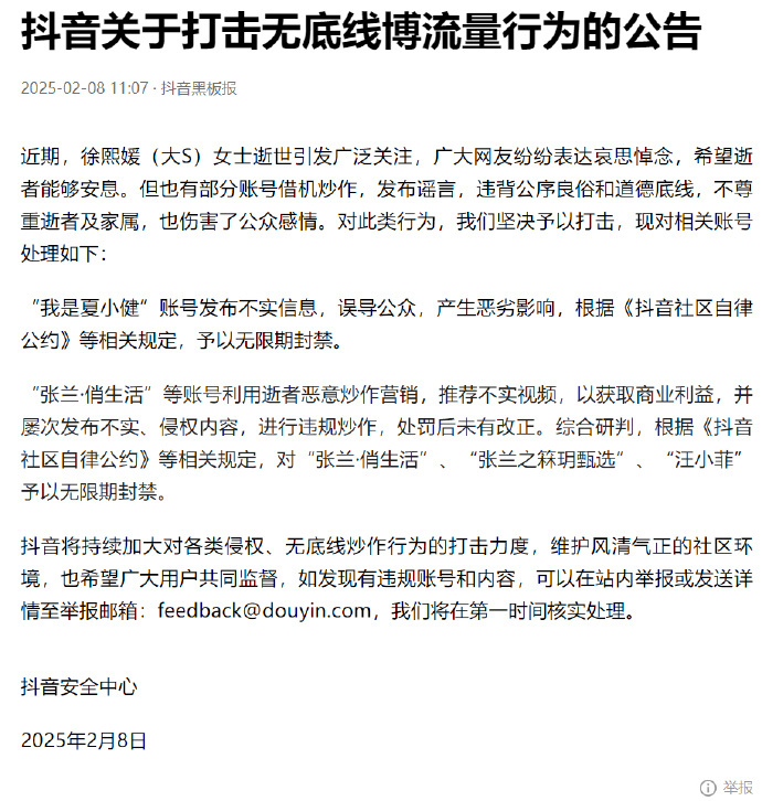 公告显示:近期,徐熙媛(大S)女士逝世引发广泛关注,广大网友纷纷表达哀思悼念,希望逝者能够安息。但也有部分账号借机炒作,发布谣言,违背公序良俗和道德底线,不尊重逝者及家属,也伤害了公众感情。其中,“张兰·俏生活”等账号利用逝者恶意炒作营销,推荐不实视频,以获取商业利益,并屡次发布不实、侵权内容,进行违规炒作,处罚后未有改正。综合研判,根据《抖音社区自律公约》等相关规定,对“张兰·俏生活”“张兰之箖玥甄选”“汪小菲”予以无限期封禁。