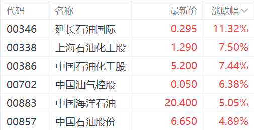 石油股中,上海石油化工股份(00338.HK)、中国石油化工股份(00386.HK)、中国石油股份(00857.HK)分别上涨7.50%、7.44%、4.89%。