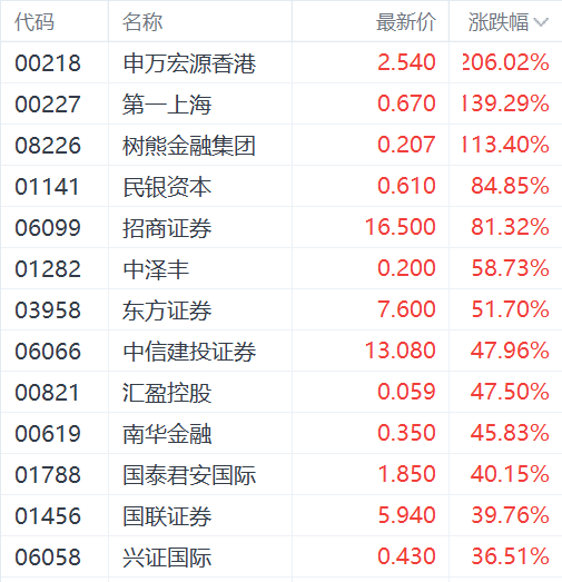 券商股中,申万宏源香港(00218.HK)、招商证券(06099.HK)、东方证券(03958.HK)分别上涨206.02%、81.32%、51.70%。
