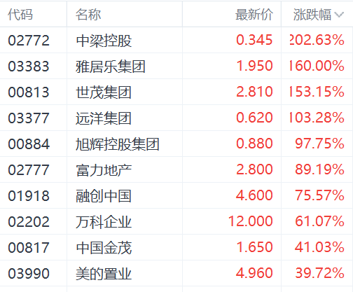 房地产股中,中梁控股(02772.HK)、旭辉控股集团(00884.HK)、世茂集团(00813.HK)分别上涨202.63%、160%、153.15%。