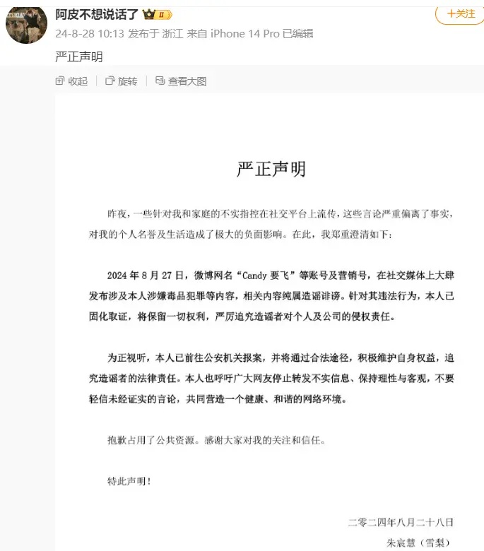 同日,雪梨否认吸毒称:“Candy要飞”等账号及营销号,在社交媒体上发布涉及本人涉嫌毒品犯罪等内容,纯属造谣诽谤,针对其违法行为,已固化取证,并已前往公安机关报案。