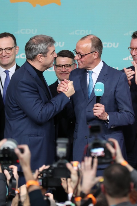 2月23日,在德国柏林的基督教民主联盟总部,联盟党总理候选人默茨(右)和巴伐利亚州州长索德尔庆祝出口民调领先。新华社发