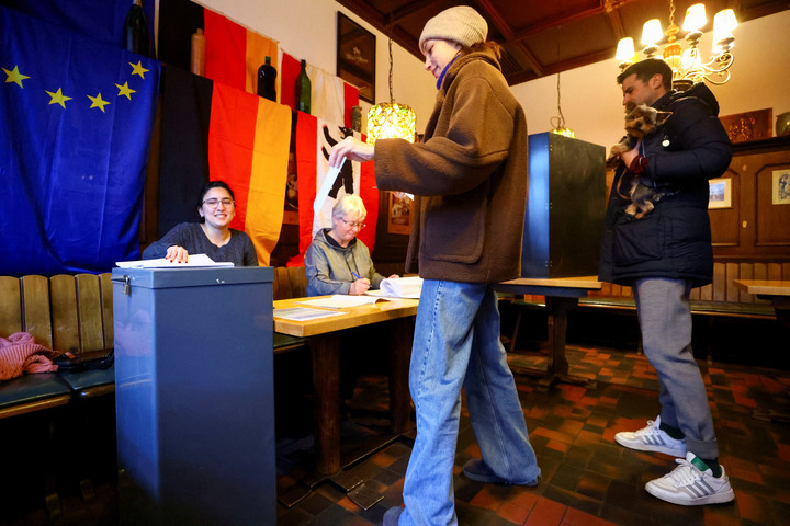 2月23日,在德国杜伊斯堡,一位选民将自己的选票放入投票箱。新华社发