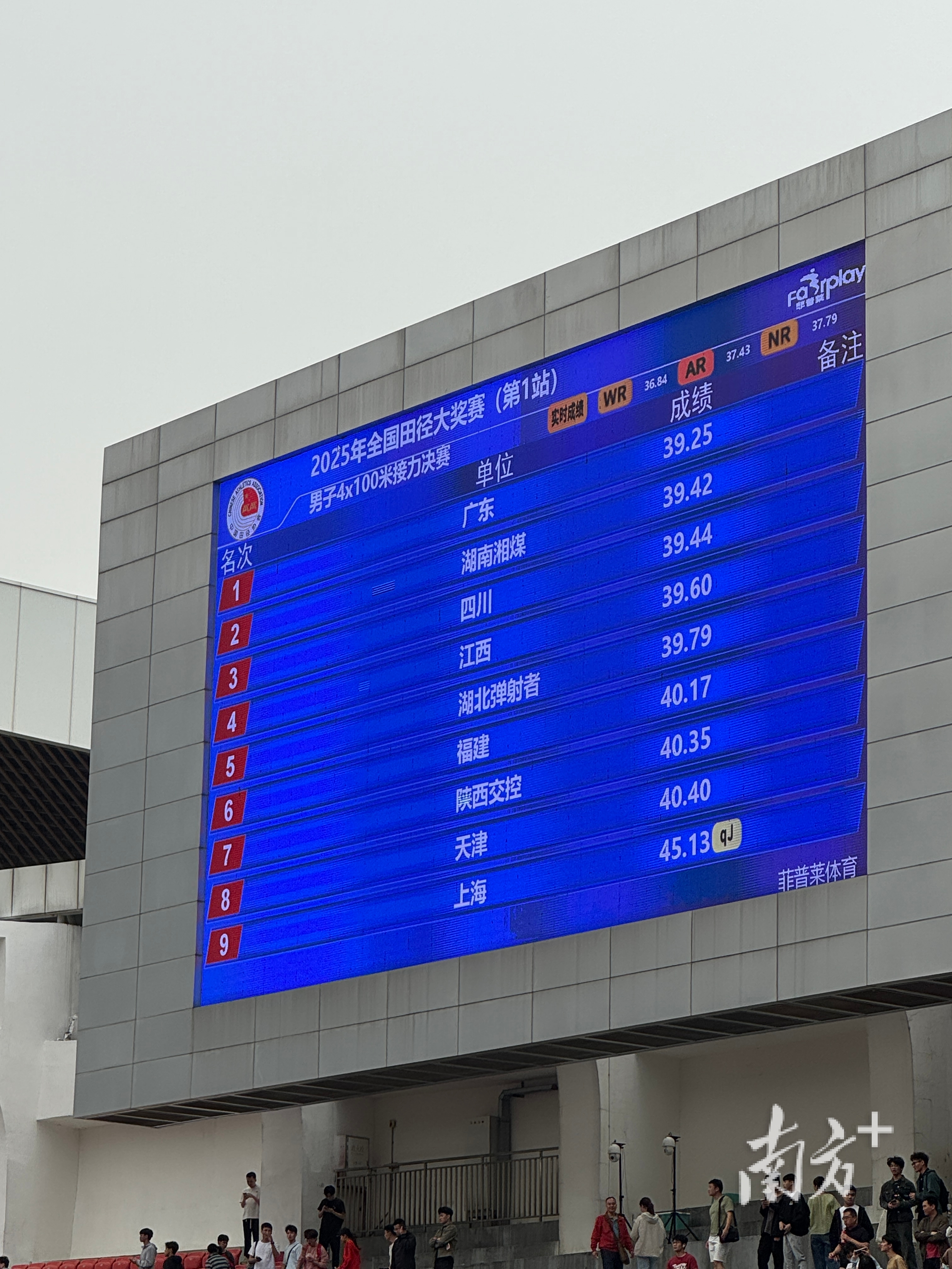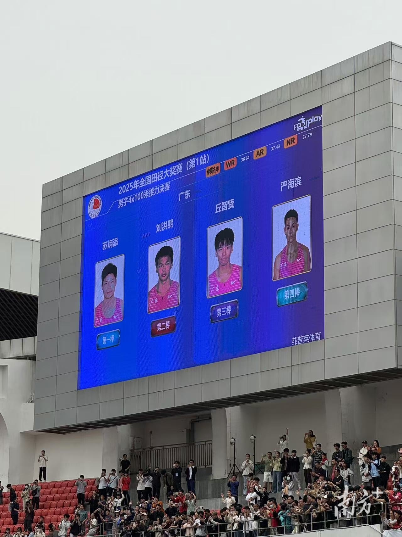 “他的标志性起跑依然不错,爆发力很强,顺利把接力棒交到二棒刘洪熙手中,广东队持续加速,目前处于领先……”现场,随着主持人的解说,观众陆续都站起来了,目光紧紧盯着广东队。随着第三棒、第四棒完成交接,严海滨进行了最后冲刺。只见他大幅提速,顶住压力,冲过终点。