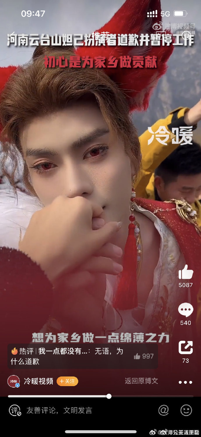 1月18日,河南云台山景区赤狐扮演者发视频称,从今天开始河南之旅要暂停一下了。因为之前扮演的赤狐,网上有一些不好的声音,对面这些声音做了深刻检讨。自己初心是想为家乡宣传出点力,将会删掉不当互动行为的视频。此前,多家媒体曾批评景区应靠景色,而不是男色留住游客。详情>>