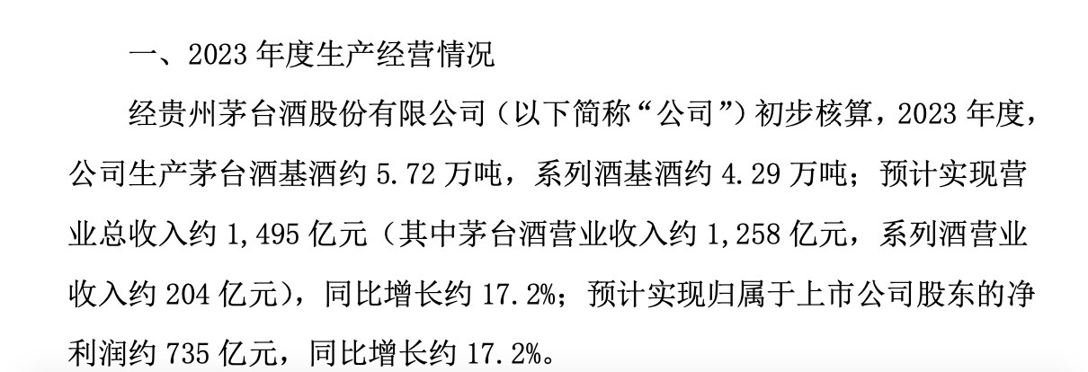 12月29日,南都湾财社-酒水新消费指数课题组记者从贵州茅台方面注意到,该公司已通过公告披露2023年经营业绩数据。根据贵州茅台公告显示,预计实现营业总收入约1495亿元,归母净利润约735亿元,预计同比分别均增加17.2%。