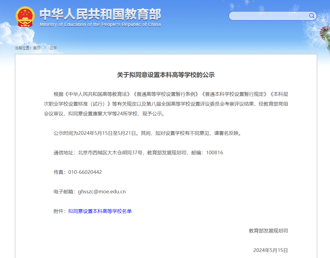 5月15日,教育部对拟同意设置康复大学等24所本科学校进行公示。其中,广东设立深圳理工大学、广东轻工职业技术大学。