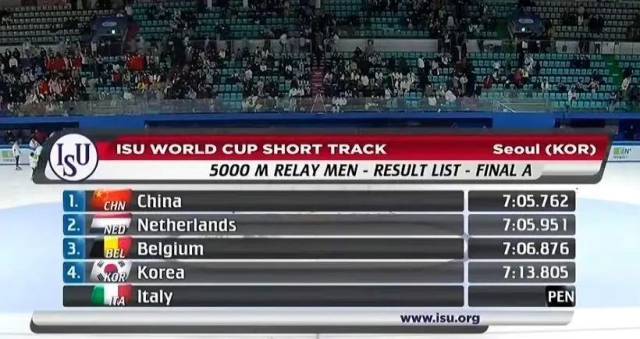 点赞!中国队夺得短道速滑世界杯5000米接力金牌