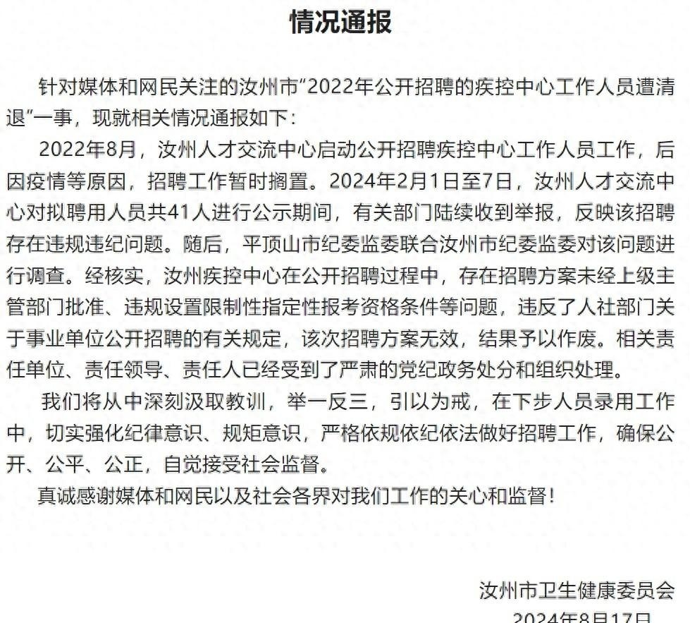 8月17日,汝州卫健委通报此事:经核实,汝州疾控中心在公开招聘过程中,存在招聘方案未经上级主管部门批准、违规设置限制性指定性报考资格条件等问题,违反了人社部门关于事业单位公开招聘的有关规定,该次招聘方案无效,结果予以作废。相关责任单位、责任领导、责任人已经受到了严肃的党纪政务处分和组织处理。