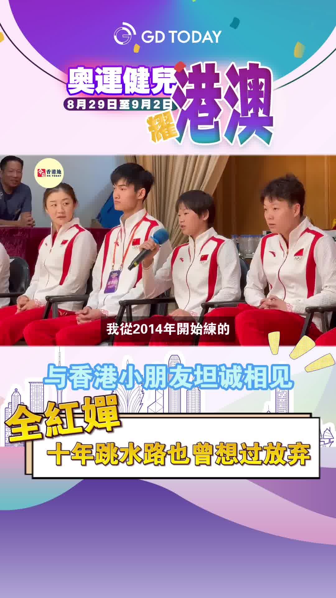 在问答环节,香港小朋友提问要练习多久才能掌握“水花消失术”,全红婵分享了自己十年的跳水训练经历。“在十年训练过程中也有过想放弃的时候,但每次我都在想,都坚持到现在了,为什么不坚持下去呢?”全红婵坦露心扉,训练确实很苦,“所以我要为自己打气,让自己做得更好。”凭着这样的坚毅,她坚持刻苦训练至今。