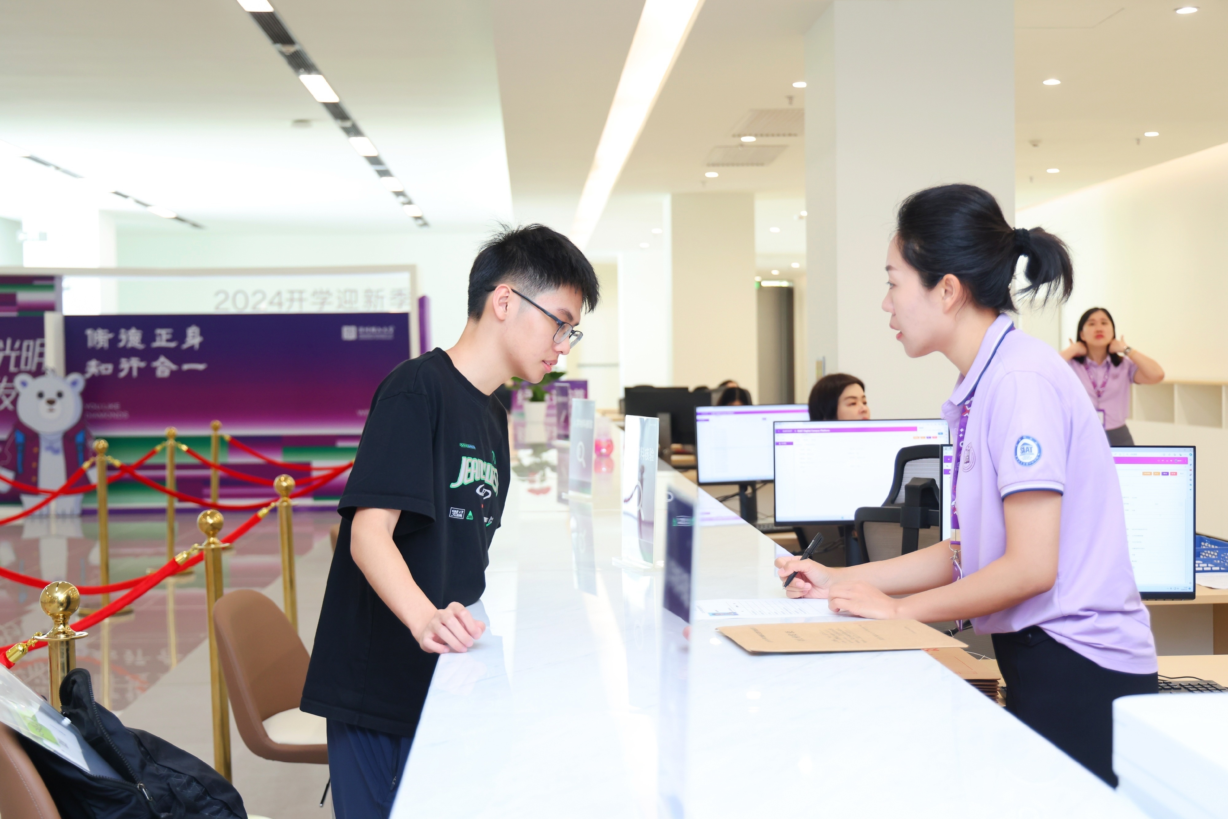 为提升学生报到效率,学校在综合楼设置一站式报到柜台,学生只需面对一位工作人员,就可以办完所有报到手续,实现了便捷和高效。此外,学校还联合腾讯云推出“深理工AI迎新小助手”,用人工智能的方式轻松回答所有关于报道和校园的疑问。