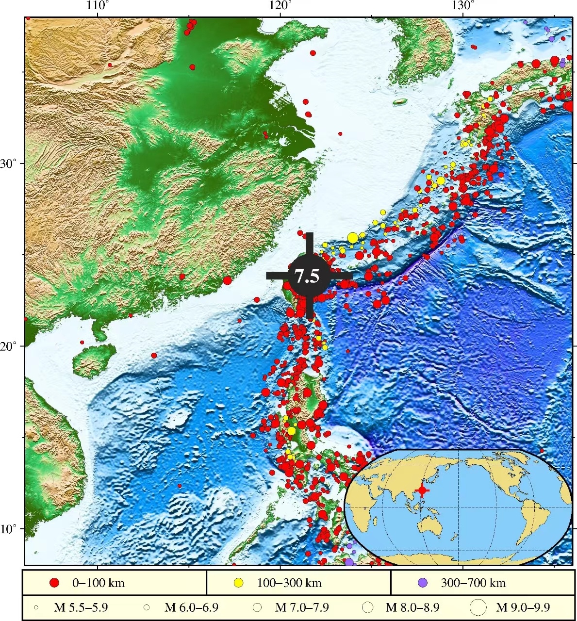2024年04月03日07时58分(北京时间),中国台湾海域(23.85°N,121.6°E)发生7.5级地震,震源深度为9千米。自然资源部海啸预警中心根据初步地震参数判断,地震可能会在震源周围引发局地海啸,预计对我国台北东,屏东西,屏东东,台东南,台东北,花莲和宜兰沿岸局部区域造成灾害性影响。
