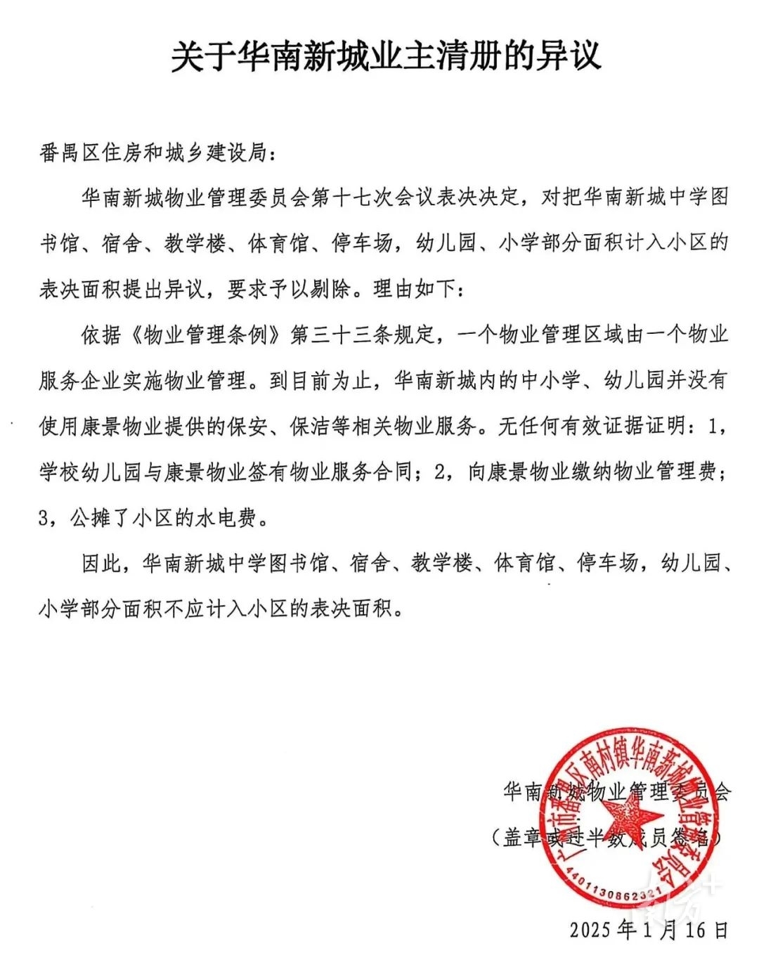 张女士介绍,下周一,这份异议书将被快递至番禺区住建局,希望番禺区住建局依法依规行政,纠正此谬误。