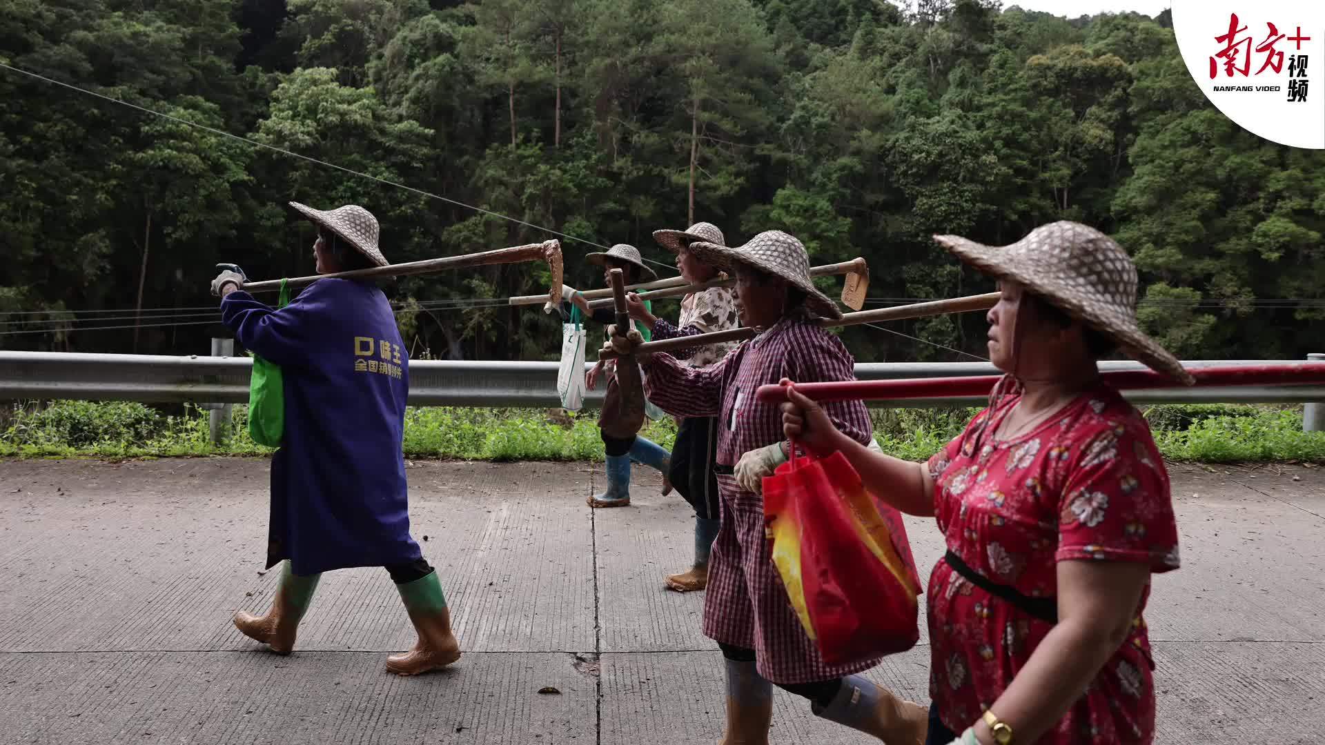6月19日,农妇们扛起锄头往另一个救援点赶去。