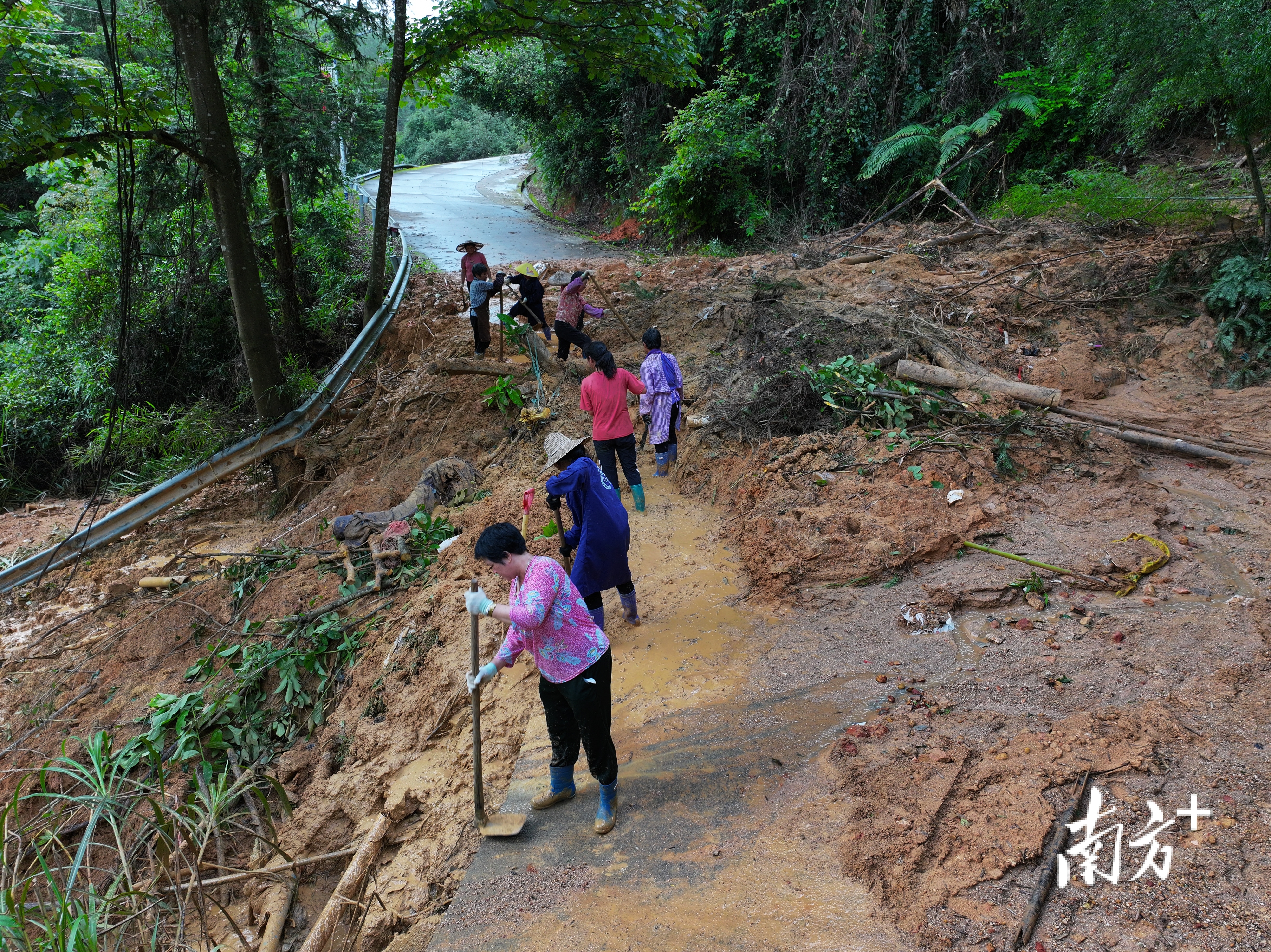 6月18日,暴雨致使道路多处塌方,10名农妇自发拿起锄头、铁锹帮忙清理路障。