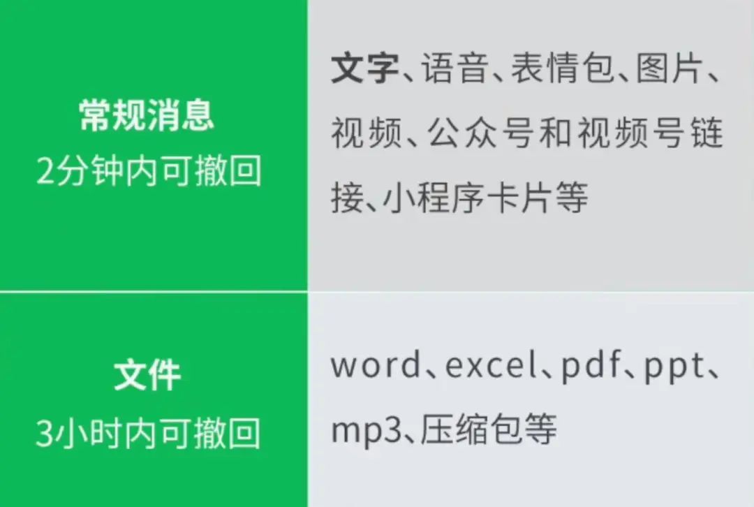微信回应消息撤回时限:微信文件3小时内可撤回,常规消息2分钟内