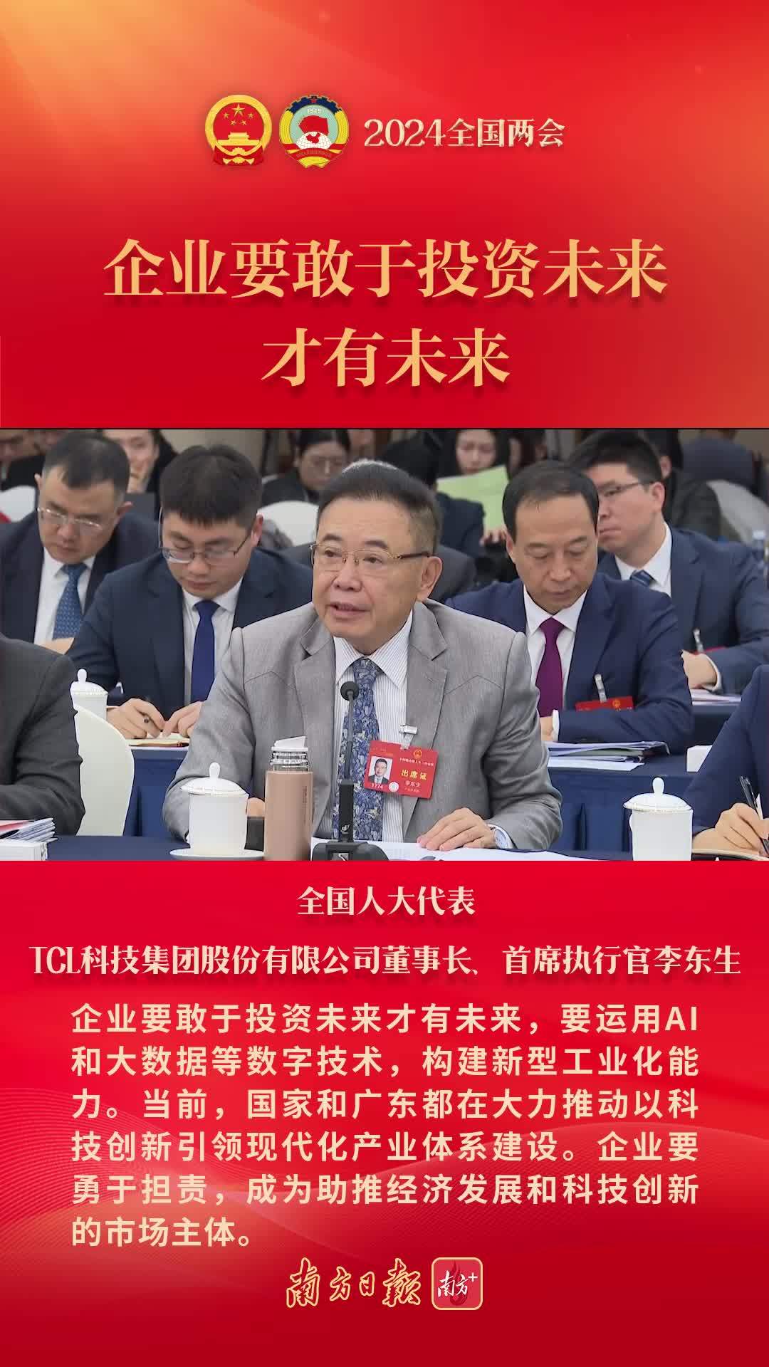 “企业要敢于投资未来才有未来。”现场,全国人大代表,TCL科技集团股份有限公司董事长、首席执行官李东生表示,发展科技制造业需要大力度的资本投入,企业要敢于投资未来才有未来,要运用AI和大数据等数字技术,开发工业软件和高端装备,构建新型工业化能力。当前,国家和广东都在大力推动以科技创新引领现代化产业体系建设。企业要敢于担责,成为助推经济发展和科技创新的市场主体。
