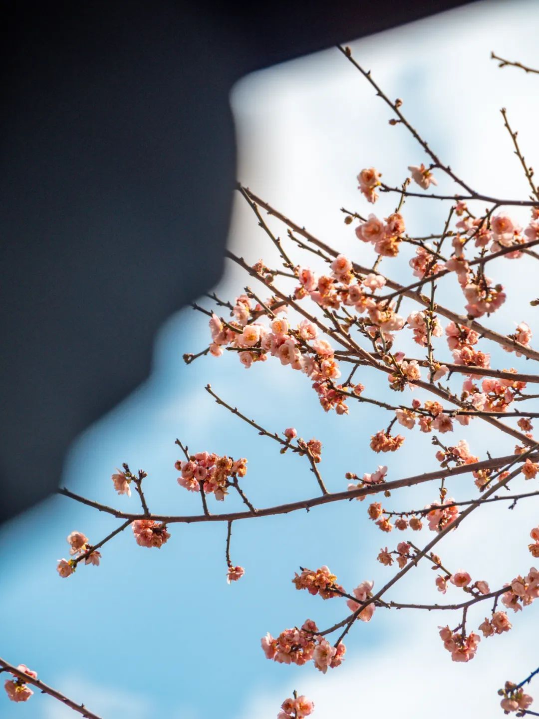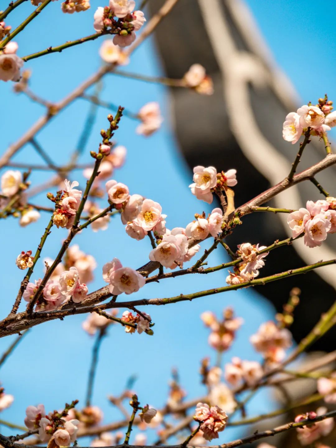 梅花从古色古香的灰瓦中