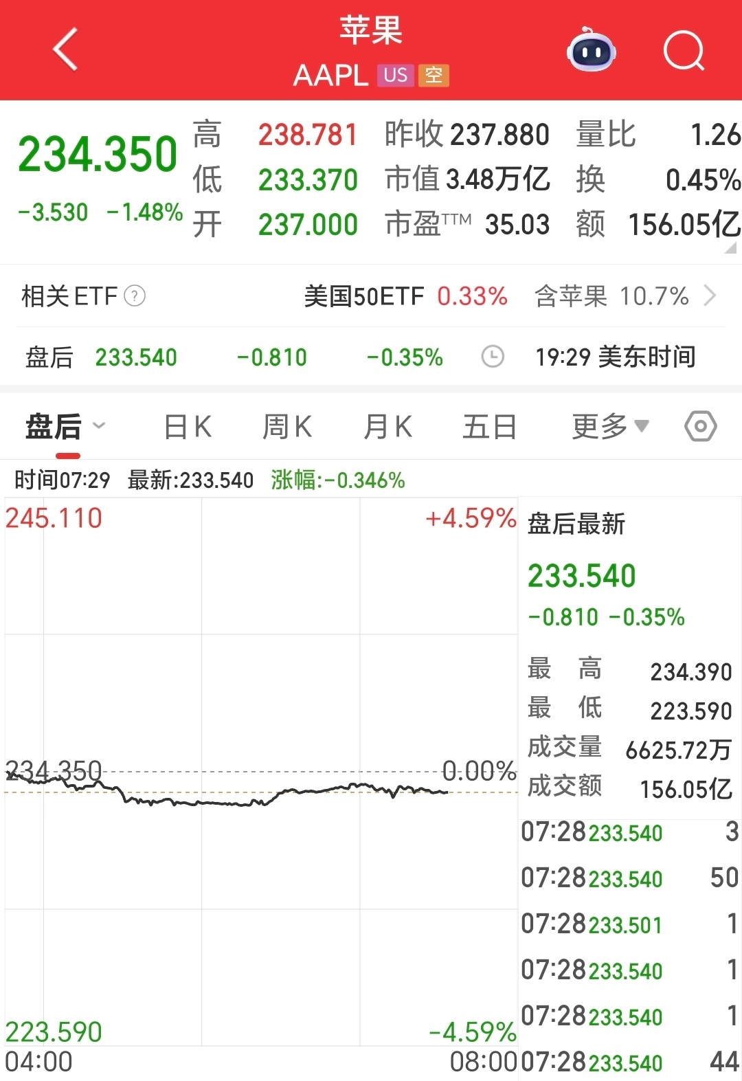 而发布会后,苹果股价收跌1.48%,总市值为3.48万亿美元。