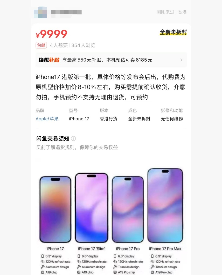 有黄牛主页显示,iPhone17港版第一批,具体价格等发布会后出,代购费为原机型价格加价8-10%左右,购买需提前确认收货,手机预约不支持无理由退货,可预约。
