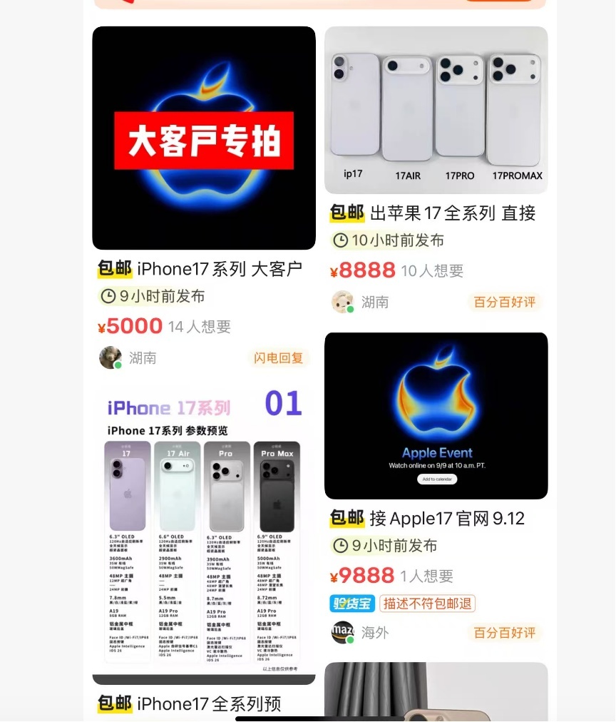 而发布会还未开始,二手交易平台上就已经出现大量代抢、预售iPhone17系列的黄牛。