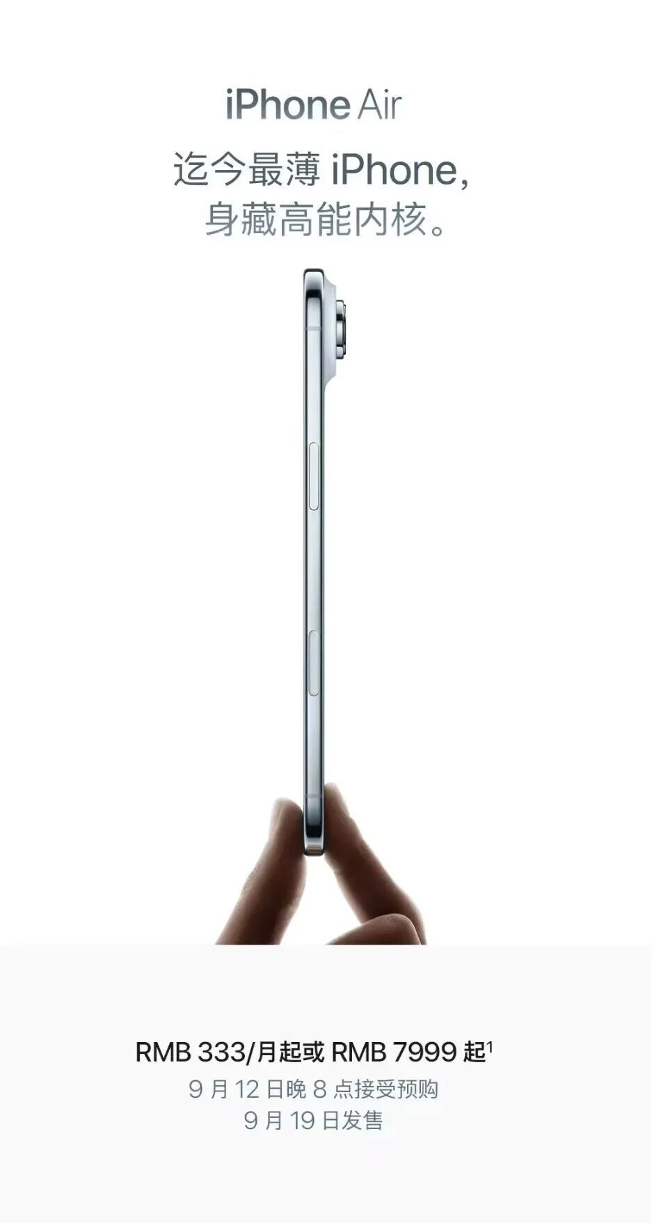 定价方面,iPhone Air起售价为7999元,定位高于标准版,面向追求轻薄设计和时尚体验的用户。