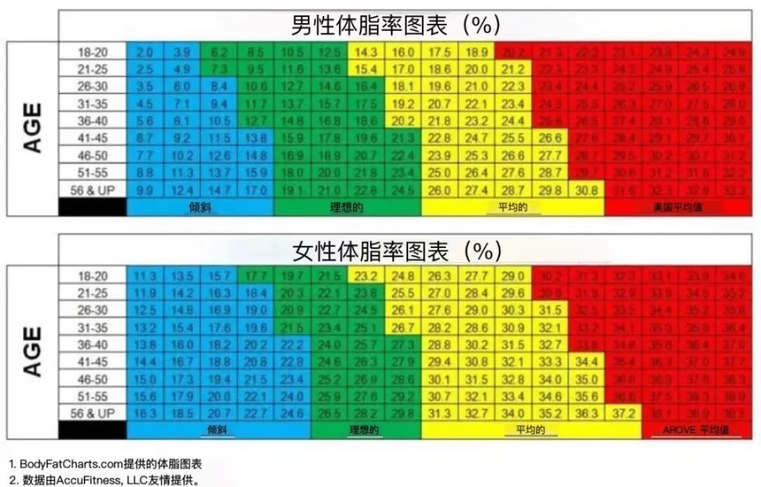 18~39岁:男性健康体脂率范围10%~20%,女性健康体脂率范围20%~30%。