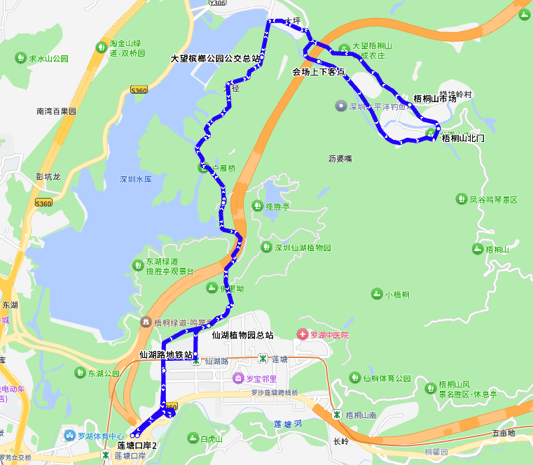 停靠站:莲塘口岸②、莲塘消防中队、仙湖植物园总站、大望槟榔公园公交总站(新平村委)、会场上下客点(临时站)、梧桐山北门(临时站)、梧桐山市场、大望槟榔公园公交总站(新平村委)、仙湖地铁站、莲塘口岸②
