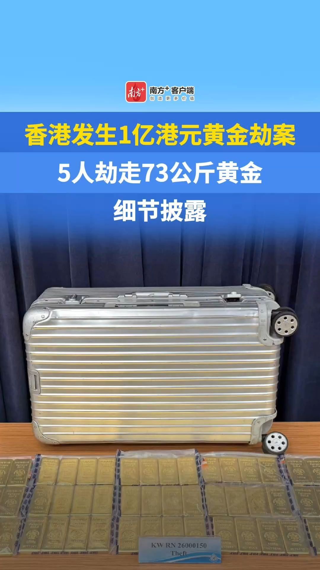据香港警方通报,香港红磡崇安街半岛广场3月20日发生一起黄金劫案,涉及73条均重1公斤的金条,价值约1亿港元。警方接报后迅速介入调查,拘捕5名涉案男女,并成功找回被劫的73公斤金条。详情>>