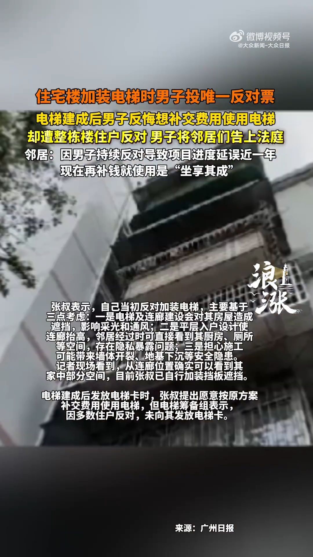 广州白云区一栋近40年楼龄的住宅楼因加装电梯引发邻里纠纷持续一年多。前期唯一投反对票的业主张叔,在电梯建成后提出补交约1.9万元费用使用电梯,却遭整栋楼住户反对,随后将十余名邻居告上法庭。详情>>