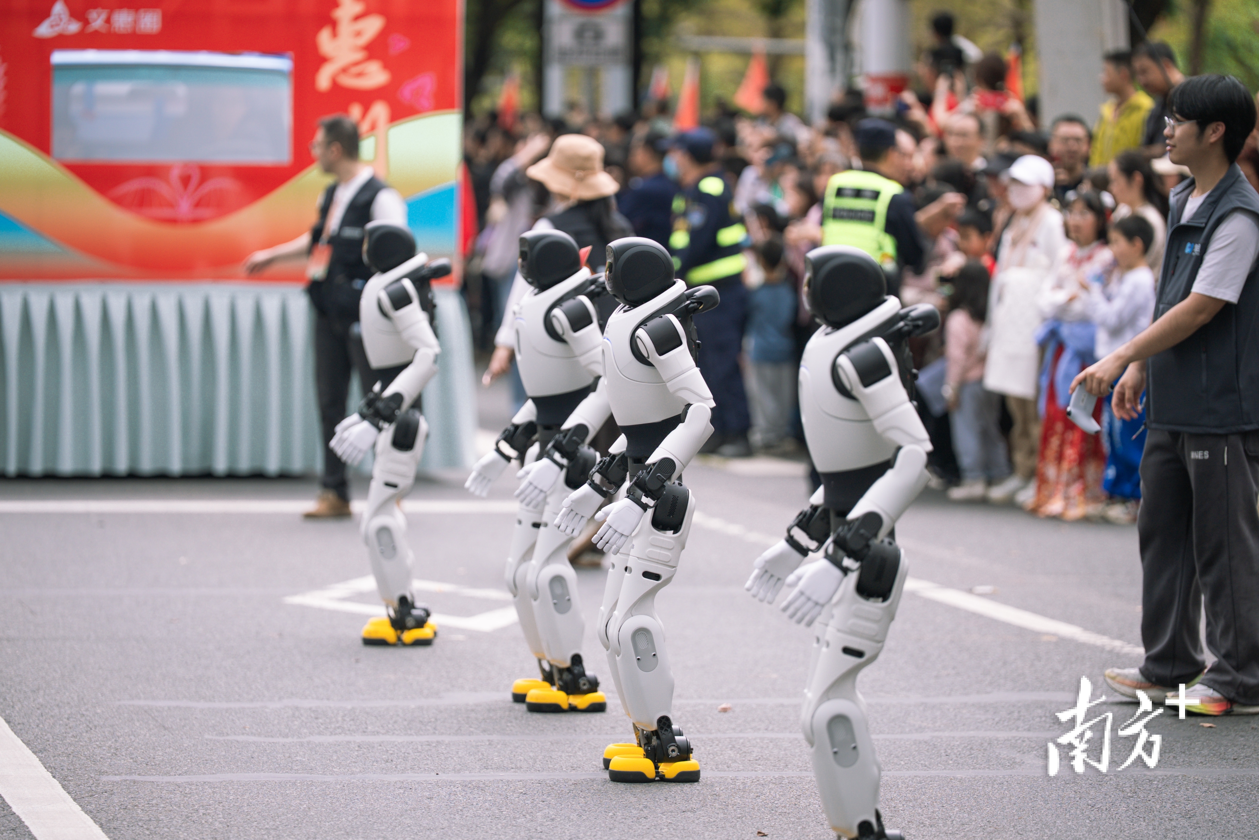 传统表达之外,也有创意尝试。剪映春风方阵将剪纸技艺与现代服装结合,服饰镂空雅致、绣有吉祥图案,走在队伍前沿的舞者旋转间仿佛彩蝶飞舞。萌机出动方阵由文创人偶和机器人组成,太极拳与醒狮动作穿插出现,呈现科技与民俗的碰撞。东坡方阵通过汉服妆造、情景演绎、经典诵读再现苏东坡惠州岁月,古今交汇。